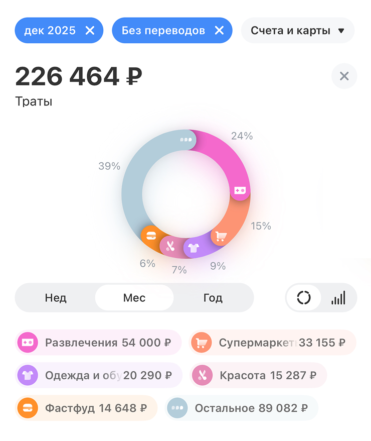 Одежда: за последний год я тратила примерно 7 000 ₽ в месяц — в год вышло 85 000 ₽. Это расходы на одежду, аксессуары, носки, колготки, нижнее белье. Старые запасы одежды стали потихоньку приходить в негодность, и я была вынуждена искать замену всему. А когда мне повысили зарплату, транжира внутри меня проснулась и встрепенулась.