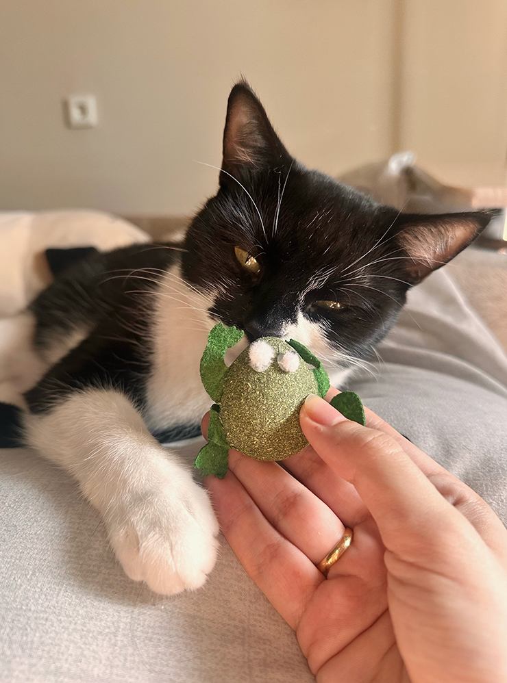 Персик не понимает, что к чему, а Гера заинтересована. Для безопасности отрываю лягухе глаза, чтобы котята их не отгрызли. Однажды мы уже извлекли инородное тело — моей милой Гере даже вырезали кусочек жировой ткани!