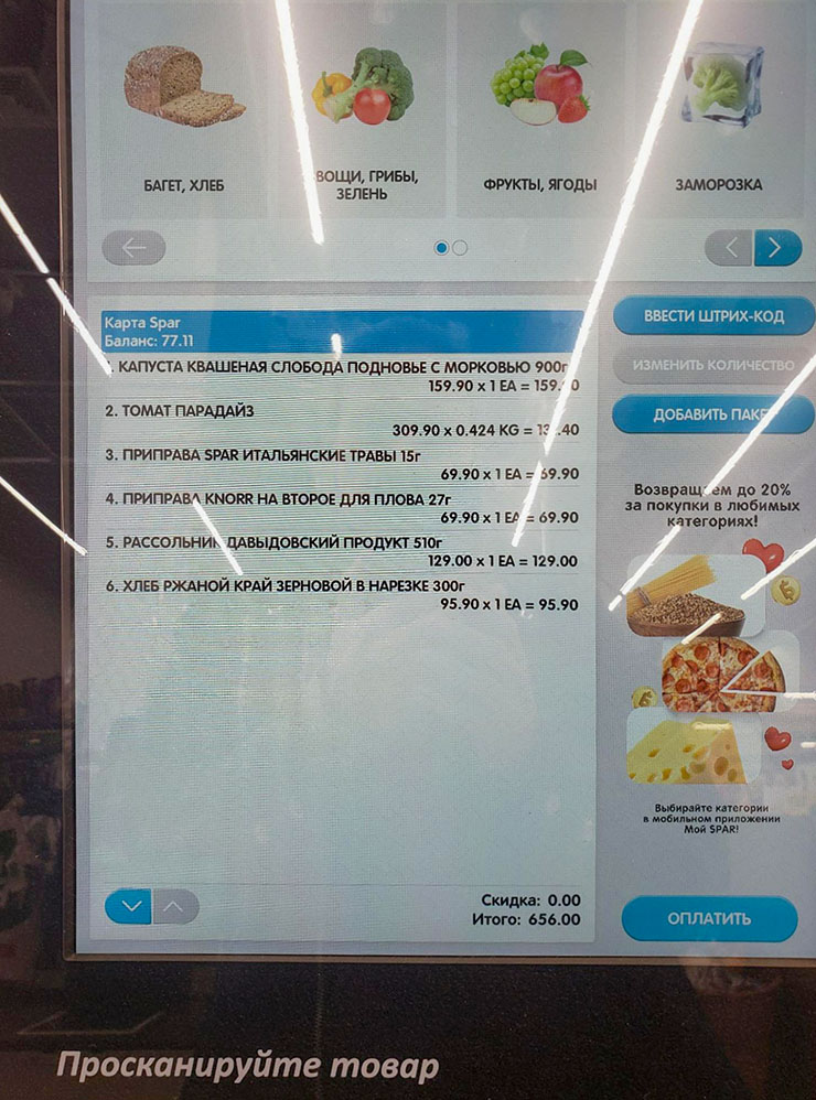 09:20. Захожу в «Перекресток». В отделе готовой еды покупаю пару сырников со скидкой 50%, в овощном беру яблоко. −88 ₽