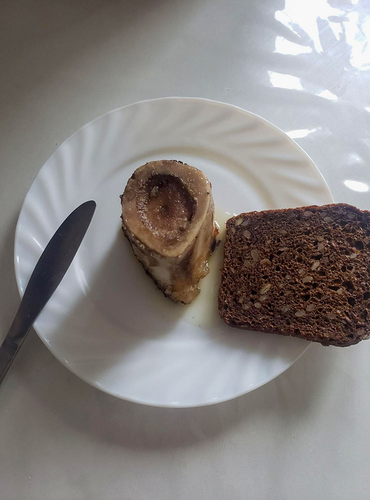 Завтракаю — сегодня будет кофе с молоком и бутерброд из зернового хлеба с костным мозгом. Вчера купила несколько трубчатых косточек на рынке и запекла. Разогреваю в микроволновке.