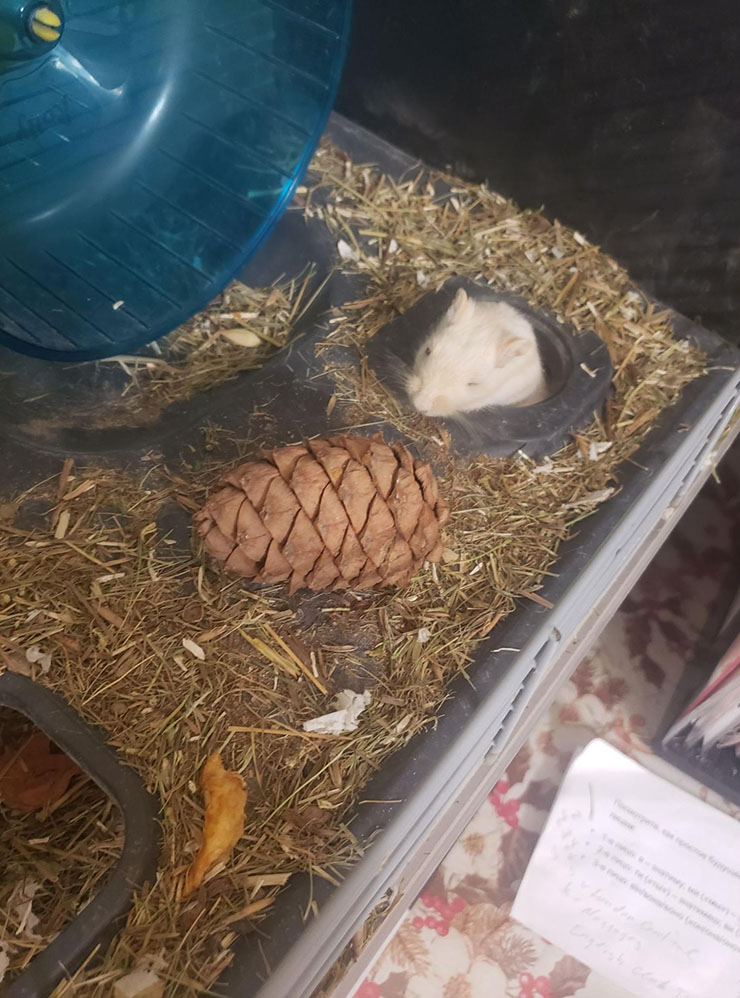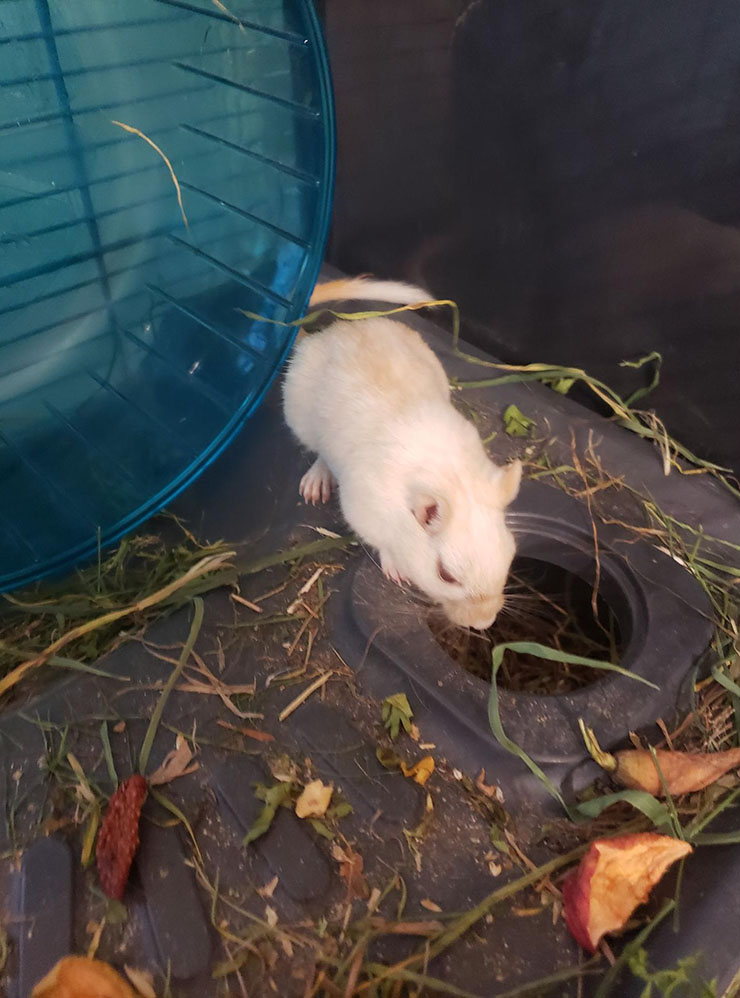 07:45. Сегодня пятница — день вкусняшек для песчанки. Даю ей пару засушенных овощей, два колоска и чуть меньше ложки специализированного корма для песчанок. Это ей на неделю. Все остальное ее питание — сено.