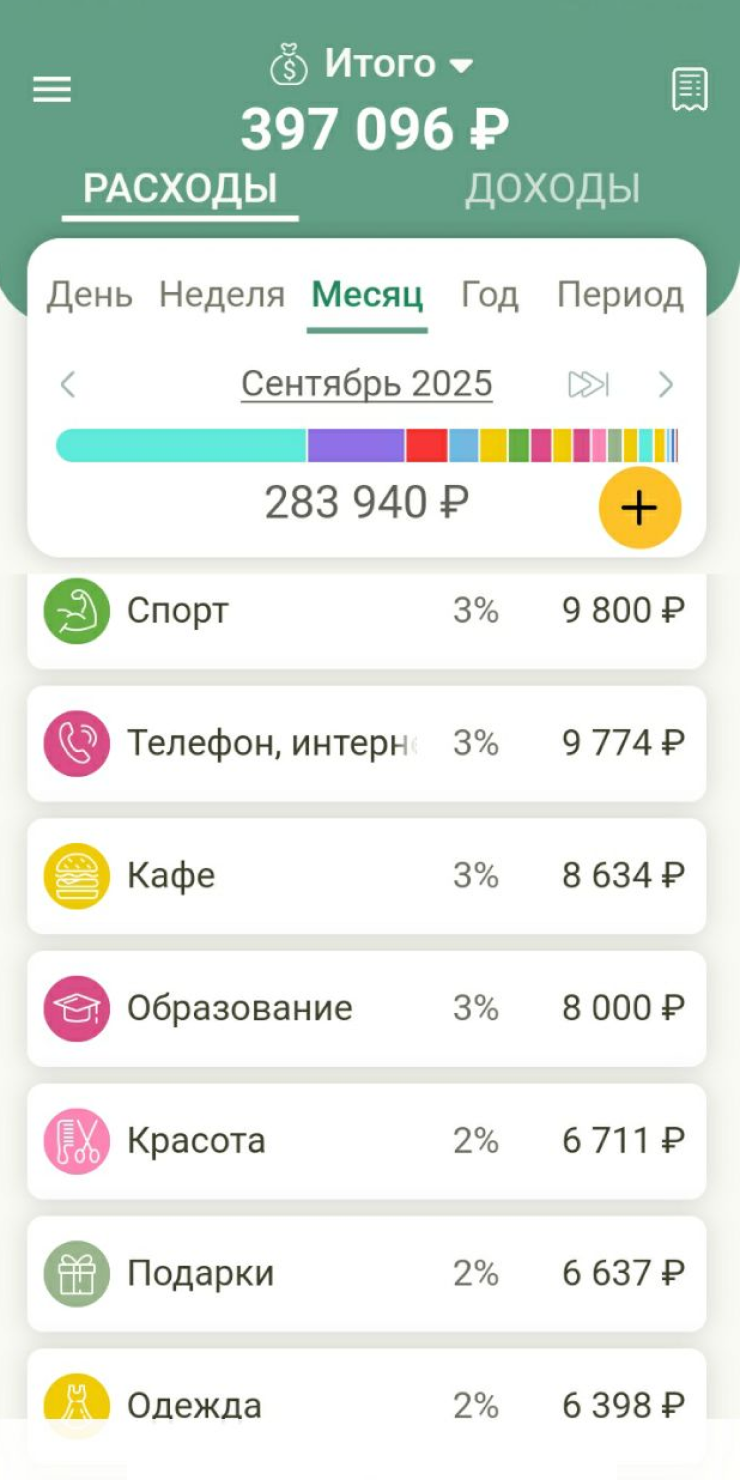 Продукты и кафе: на питание в прошлом месяце ушло 39 000 ₽. Из них 16 000 ₽ — супермаркеты, 13 000 ₽ — кафе, 10 000 ₽ — обеды на работе.