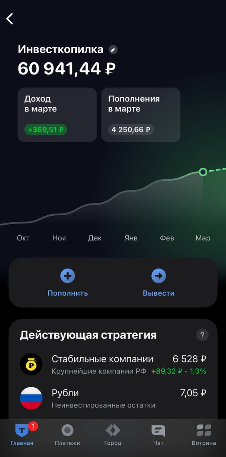 Дополнительно пользуюсь инвесткопилкой — там деньги копятся незаметно. У меня настроено округление с умным шагом плюс перевод 300 ₽ каждый понедельник. Сейчас на счете около 48 000 ₽. Вывожу по потребности или закидываю на большой счет.
