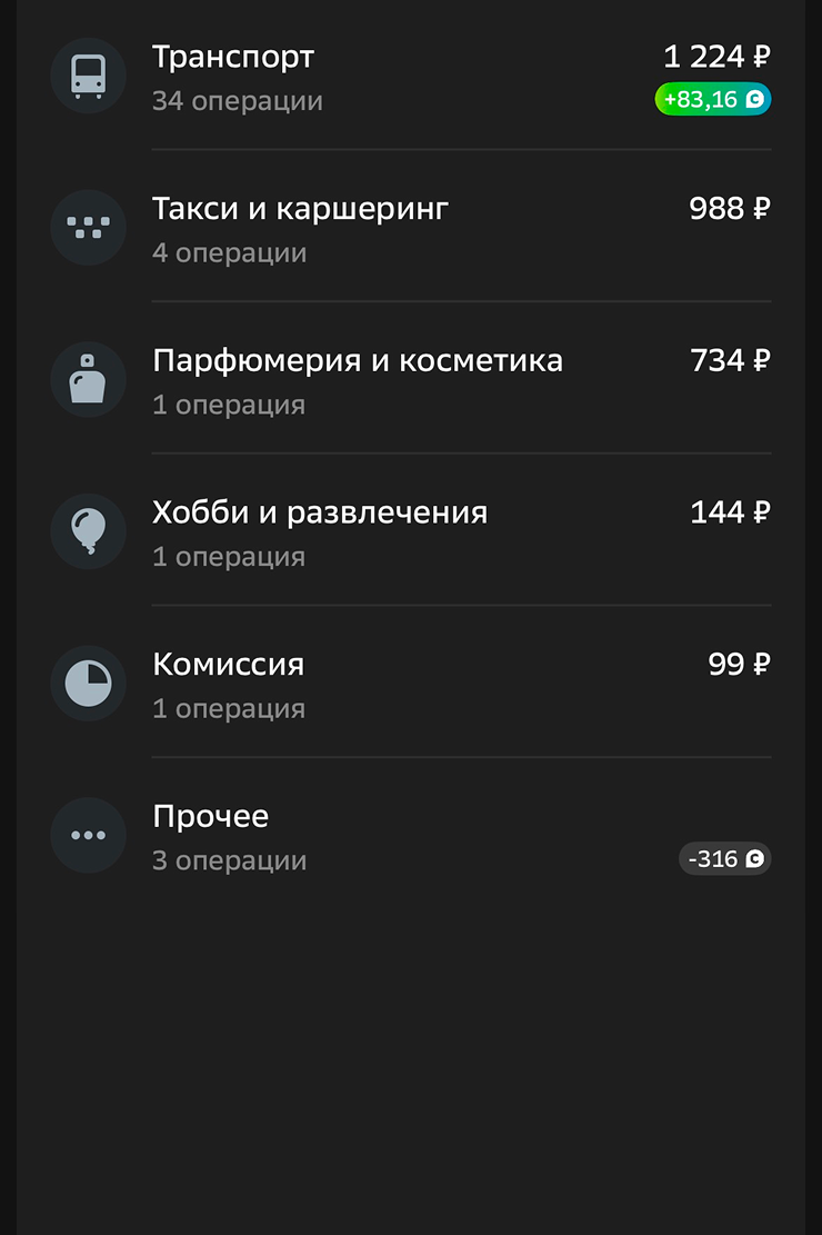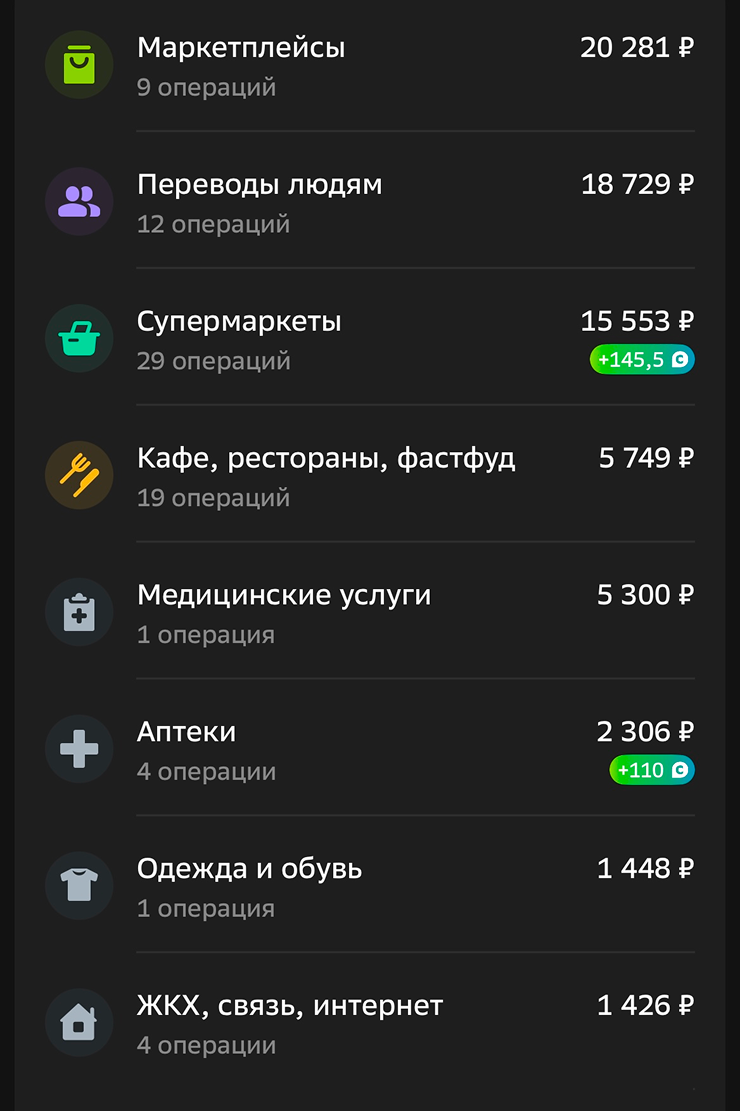 У меня нет кэшбэка, только бонусы «Спасибо» — всего по 200—300 в месяц из-за скупого выбора категорий. У мужа есть, но сумму не знаю.
