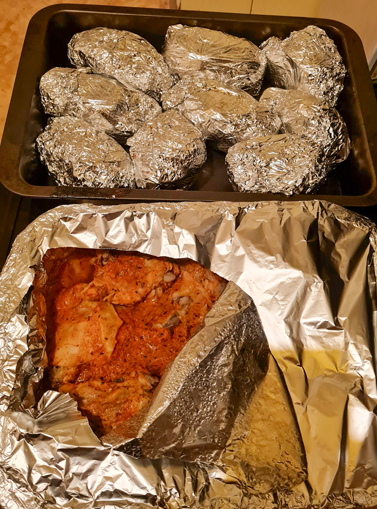 19:30. Встаю. Разогреваю духовку, ставлю курицу для С. и готовлю ужин себе — варю сосиски, макароны, достаю из холодильника соленья.