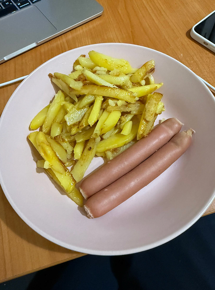 01:00. Ужинаем с Н. картошкой и сосисками. Ужин, конечно, приготовила девушка. Смотрим серию «Отчаянных домохозяек», читаем тредсы*, пьем ромашковый чай.