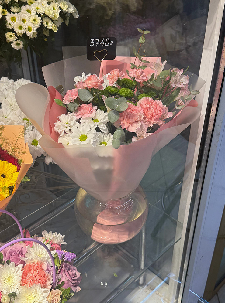 21:00. Вышел купить цветы для девушки. Ей нравятся белые розы, поэтому взял 11 штук, плюс выбрал атласную ленту и открытку. −4 650 ₽
