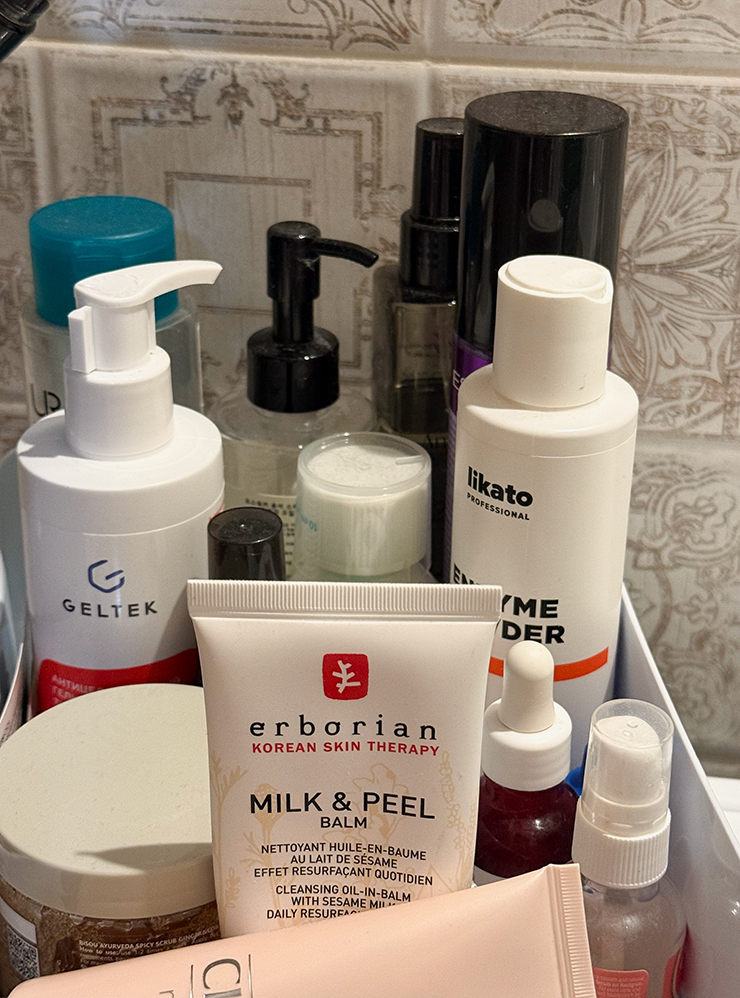 Люблю уходовую косметику, потому что в основном не крашусь. Считаю, что здоровое, чистое лицо без высыпаний и лишнего жирного блеска лучше любого макияжа. Собрала для себя неизменный уже года два набор: пенка для умывания Payot, пилинг-бальзам Erborian, сыворотка с ретинолом La Roche-Posay, ночная увлажняющая маска Clinique, дневной крем La Roche-Posay, мицеллярная вода Uriage. Раньше не могла себе позволить эти бренды, потому что зарабатывала сильно меньше. Из новых приобретений — гидрофильное масло для снятия макияжа, спрей для легкого расчесывания волос и разогревающий гель Geltek — это топ!