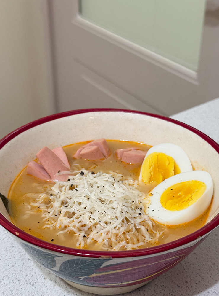 21:00. Можно выдохнуть. На ужин сделала быструю лапшу, но эстетично: закинула туда сыра, сосисок и яйцо.