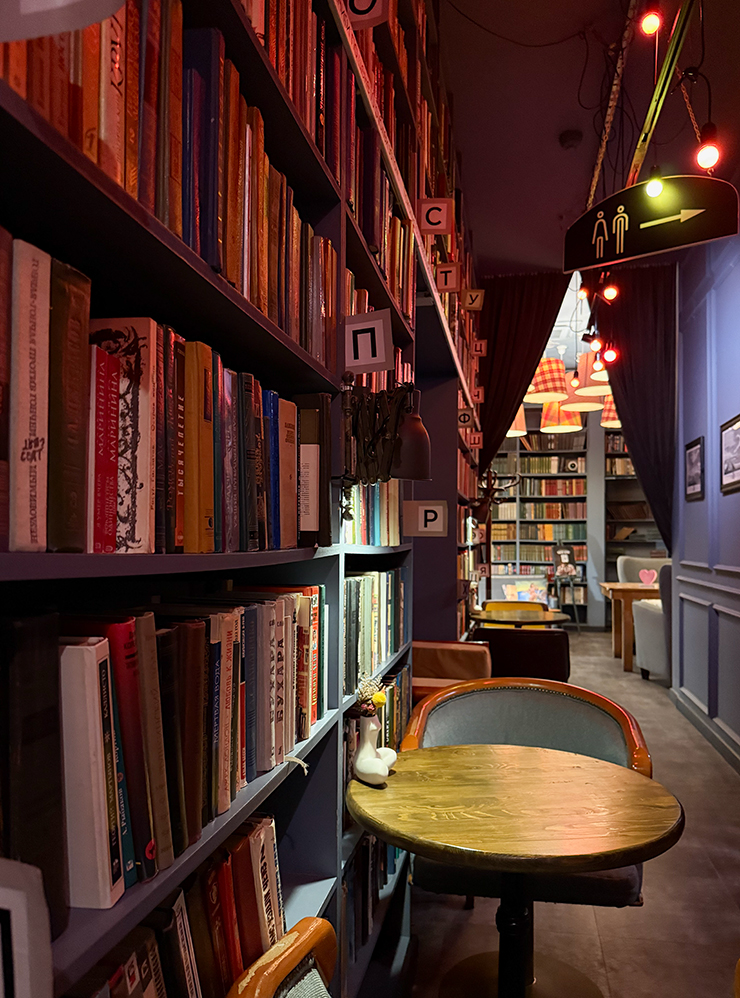 17:00. В честь большой покупки решили зайти в ресторан и поужинать. Выбирала я. Пришли в уютное местечко «Мы же на ты», где есть зал-библиотека.
