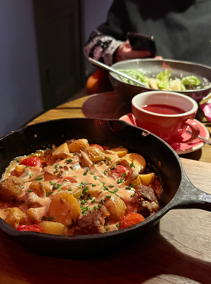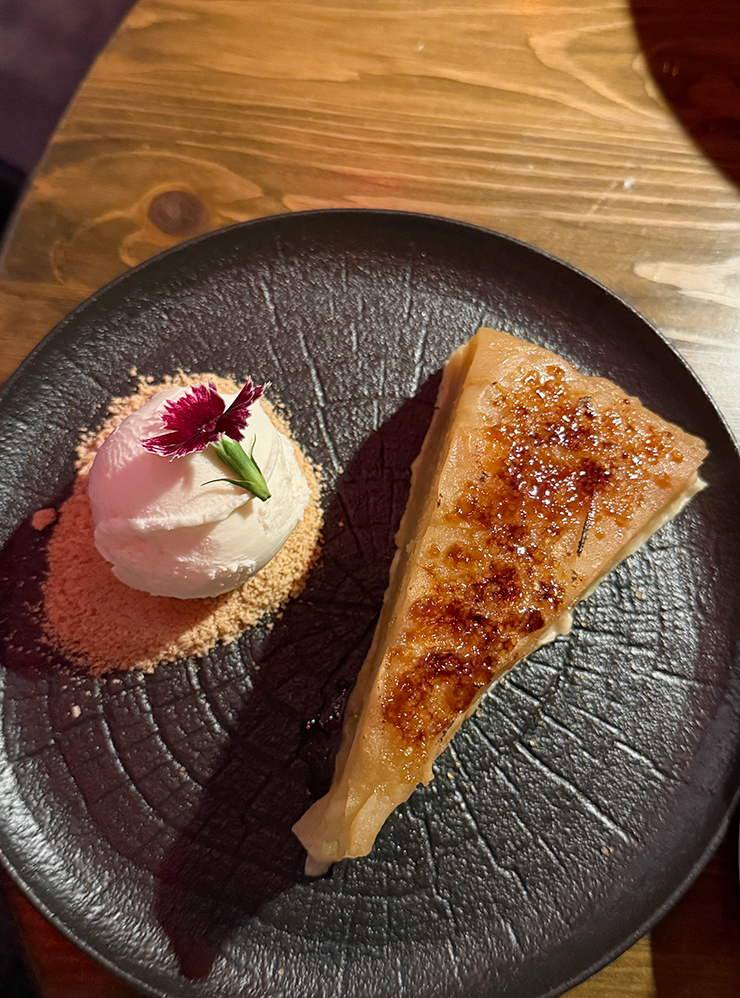 Взяла себе сковородку с картофелем и реберным мясом, чай и десерт — пирог с тонко нарезанным яблоком и совсем небольшой прослойкой пропитанного теста плюс шарик мороженого на песочной крошке. Все во рту «поженилось». За ужин платил муж, сумму не знаю.