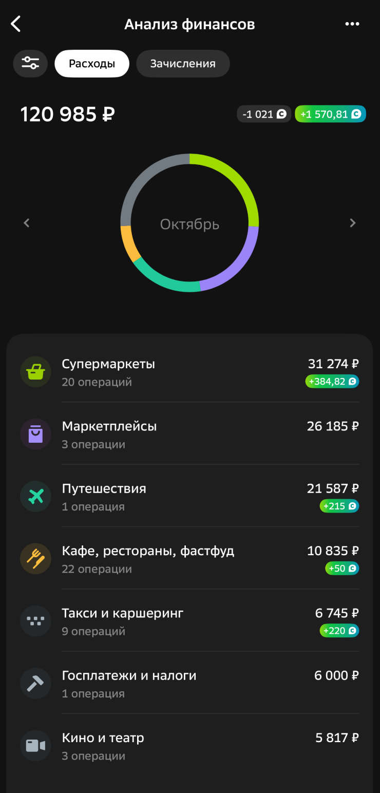 - «Спасибо» от Сбера — мне приходит около 1 500 ₽, трачу на доставку продуктов. Какой кэшбэк у мужа, не знаю, он его тратит на аптеки.