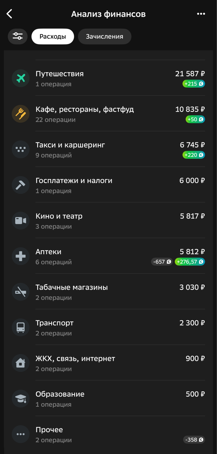 20:15. Доехала до дома на такси. −433 ₽
