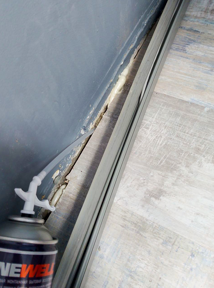 14:10. Появился свободный час, и я решил пропенить пол в спальне. Снимаю плинтус и заливаю пеной дыры: так мы боремся с курильщиками внизу. Запах от соседей проходит через потолок, проветривание помогает лишь временно.