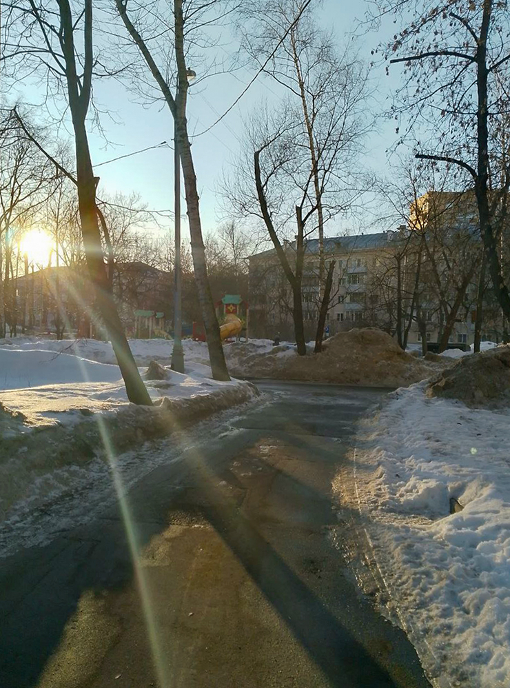 13:00. Выезжаем. На улице солнечная весенняя погода, но еще много снега. По дороге делаем небольшой крюк через Московскую область, чтобы развернуться, там покрытие совсем разбито, ямы глубиной в полметра. Вместе со снегом сходит и асфальт.