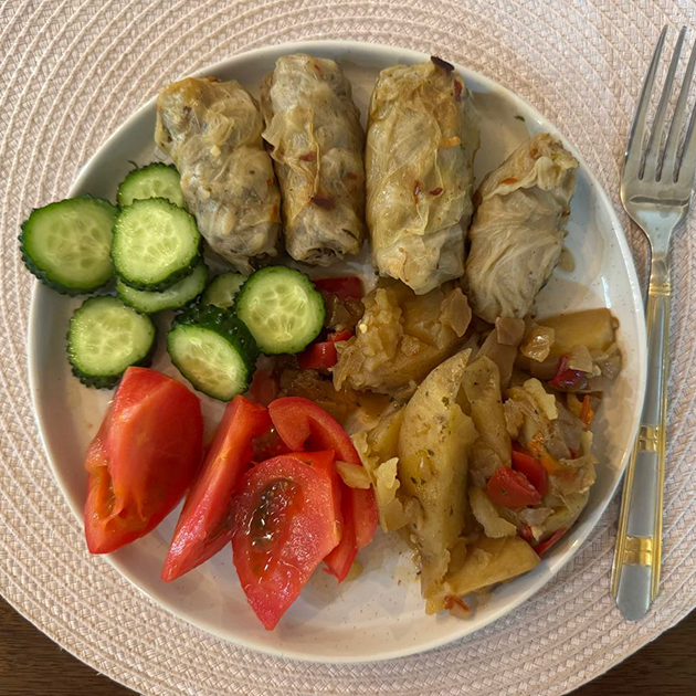 15:00. Мчу на обед. В выходные был день рождения одной из сотрудниц, и она заказала осетинские пироги. Это добровольная история, никто не обязан покупать угощения на свои праздники, но в основном все что-то приносят. Я ем свои голубцы с овощами и беру два небольших кусочка пирога.