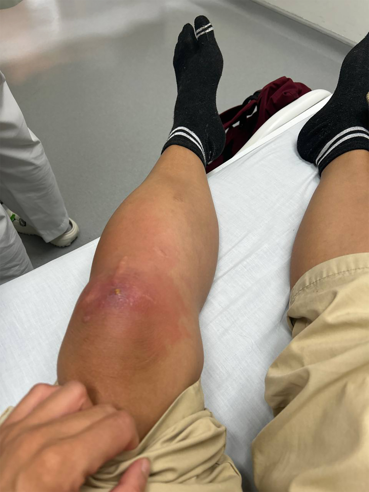 Гнойник вскрылся сам еще в первые сутки. Медсестры несколько раз выдавливали из него гной при помощи салфеток и инструмента, похожего на кухонные щипцы, — количество жидкости впечатляло. Они даже сняли происходящее на телефон, чтобы показать практикантам, как работать с подобными случаями. Процедуру проводили прямо в палате, она занимала не больше десяти минут. Каждый раз мне предлагали обезболивающее, но ощущения были терпимыми, и я отказывалась. После процедуры на колено накладывали новую повязку, а перед этим разрешали сходить в душ и выдавали свежую пижаму.