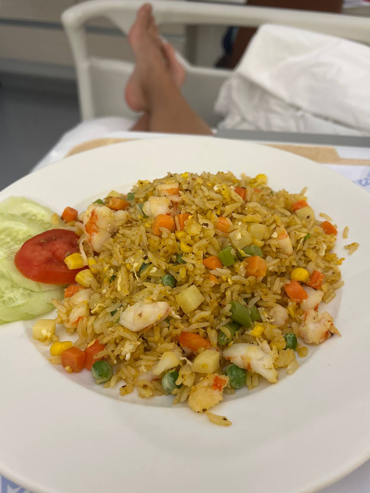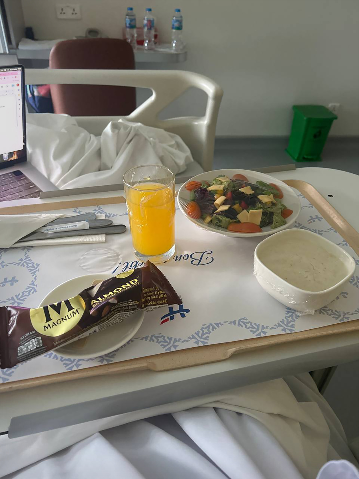 Условия. В палате были все удобства: душ, туалет, телевизор, шкафы и рабочие столы. Еду тоже приносили прямо в палату трижды в день, ее полагалось выбирать из меню. Она была качественной, но предсказуемо пресной — все скрашивали фрукты и мороженое. А еще в списке вьетнамских блюд почему-то не оказалось фо бо, зато среди европейских нашелся «русский салат»: отварные морковь и картошка с очень вкусным майонезом.