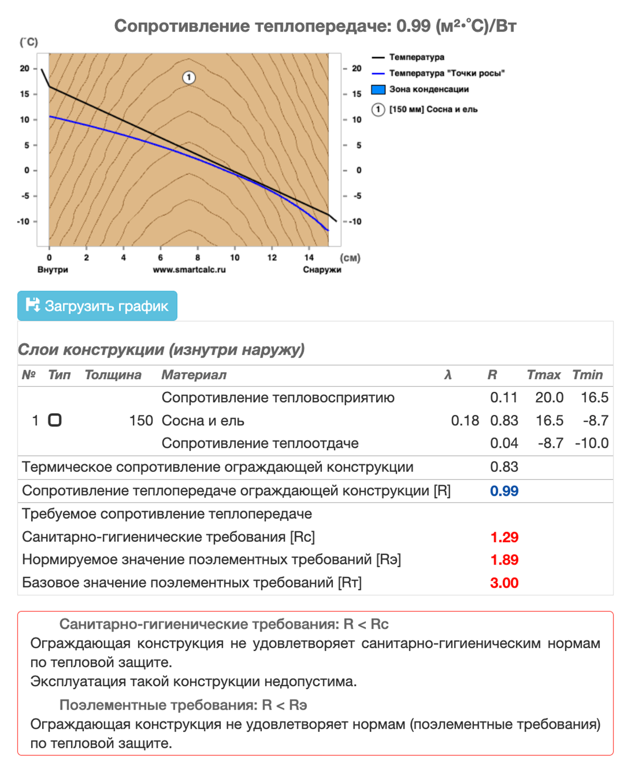 Посмотрим, что скажет теплотехнический калькулятор для стены из клееного бруса толщиной 150 мм. Напомним, что по строительным нормам для жилых домов в средней полосе России сопротивление теплопередаче стены должно быть не ниже 3 м² × °C Вт .