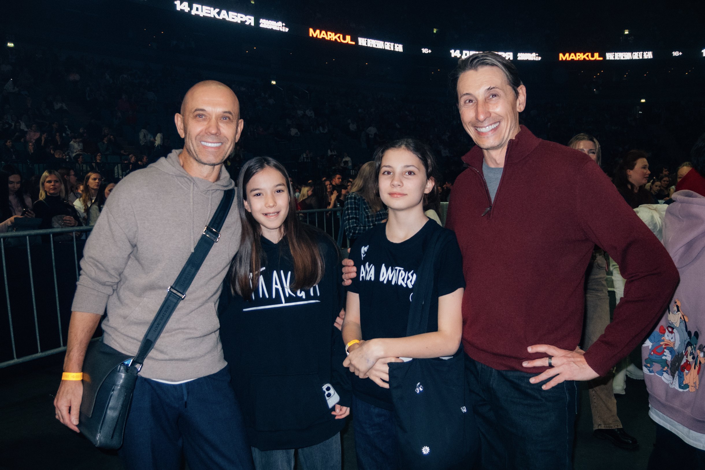 Юрий и Кирилл: «У нас обоих дочки 12 лет, они обожают Ваню Дмитриенко, так что сегодня мы здесь в качестве их сопровождения. Первый раз слушали его песни в машине по дороге на концерт и оценивали их по десятибалльной шкале. В целом неплохо, некоторым даже поставили 8.