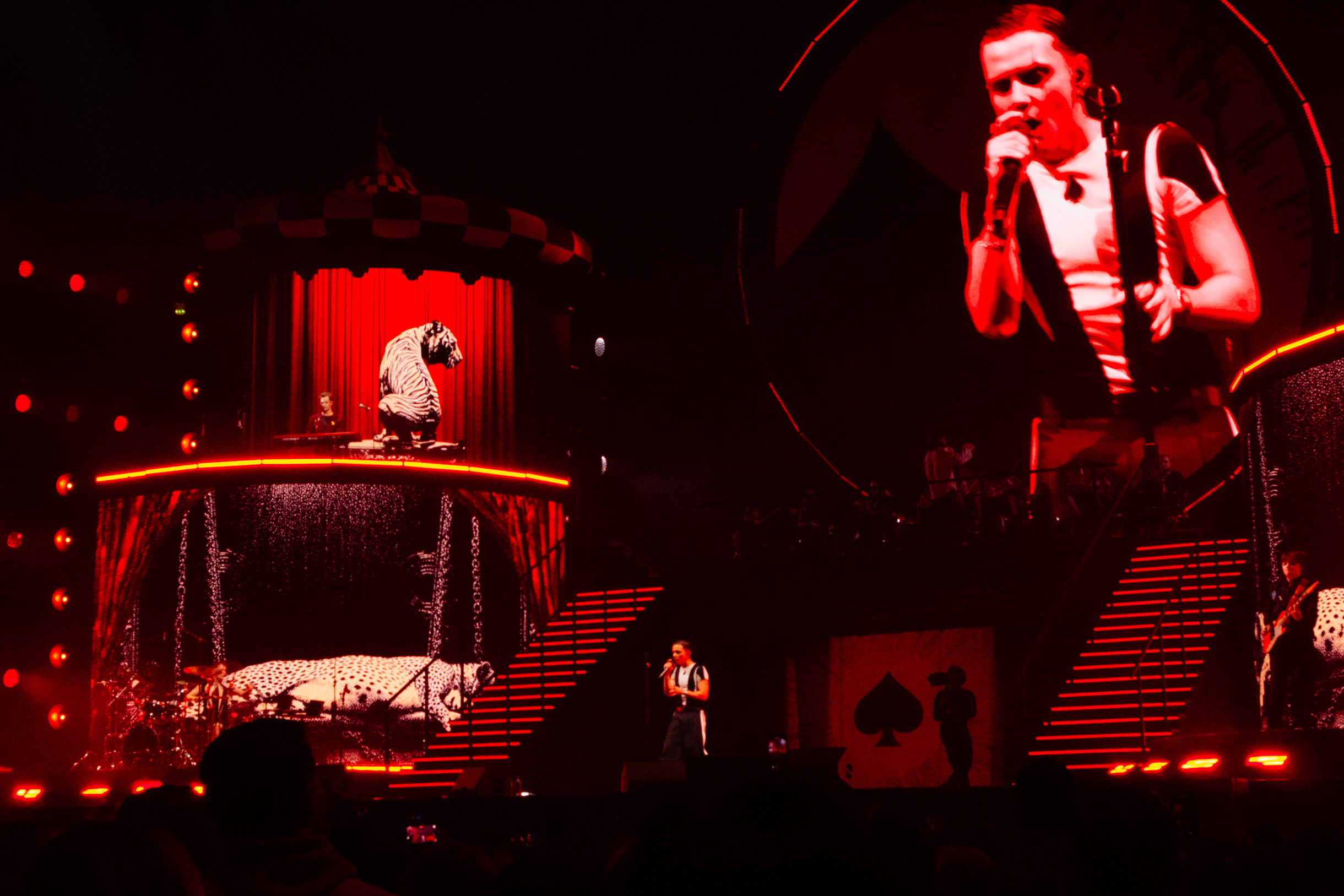 🎪 Концерт прошел в цирковой эстетике. Все декорации и костюмы выдержали в красно-бело-черной гамме, а над сценой соорудили полосатый купол. Было ощущение, что ты находишься внутри люксовой копии той самой масленки из «Фикспрайса». Перед стартом концерта крутили видео с Ваней в образе Джокера, во время которых певец эффектно выпрыгнул на сцену под цирковой марш.