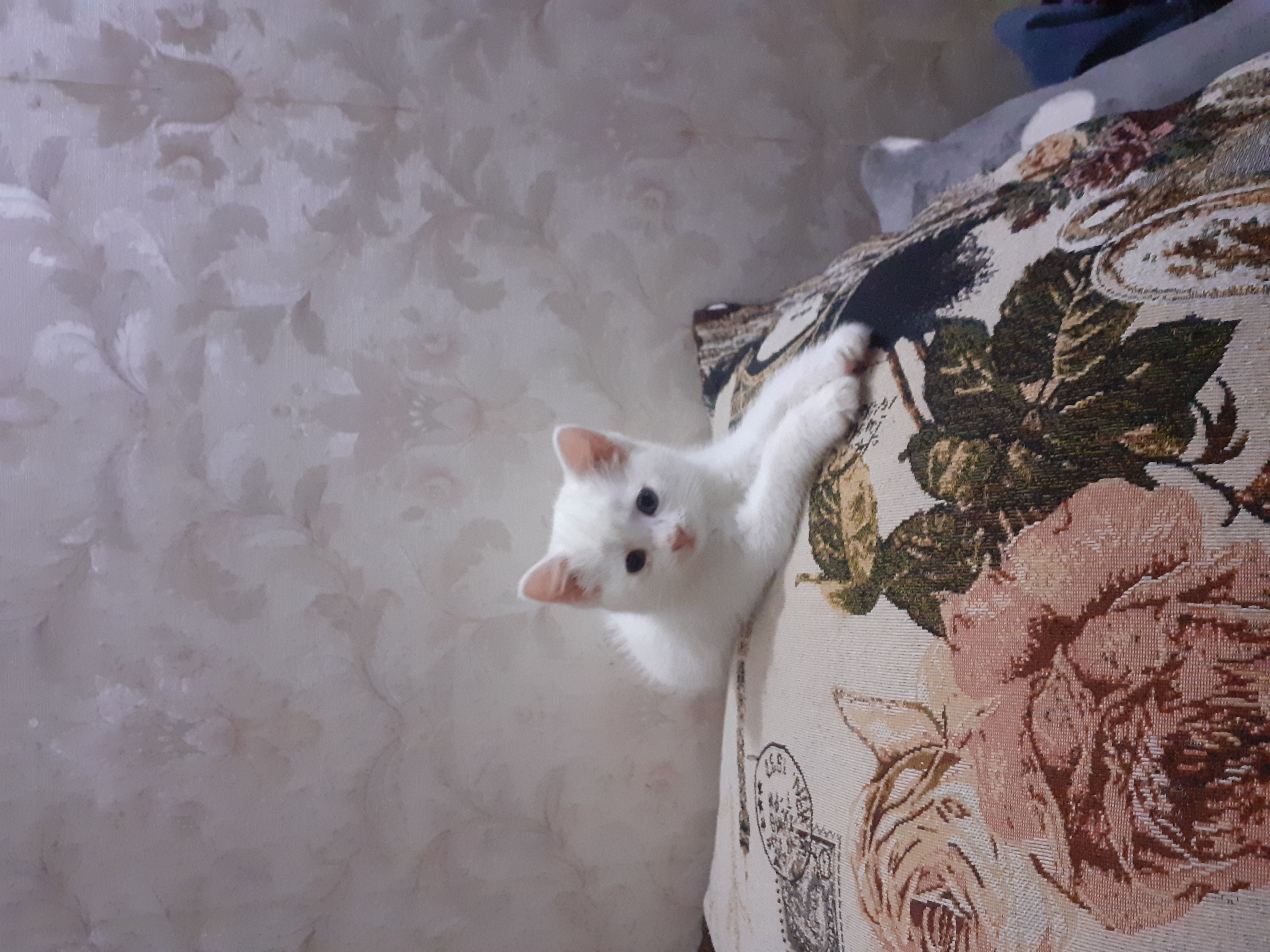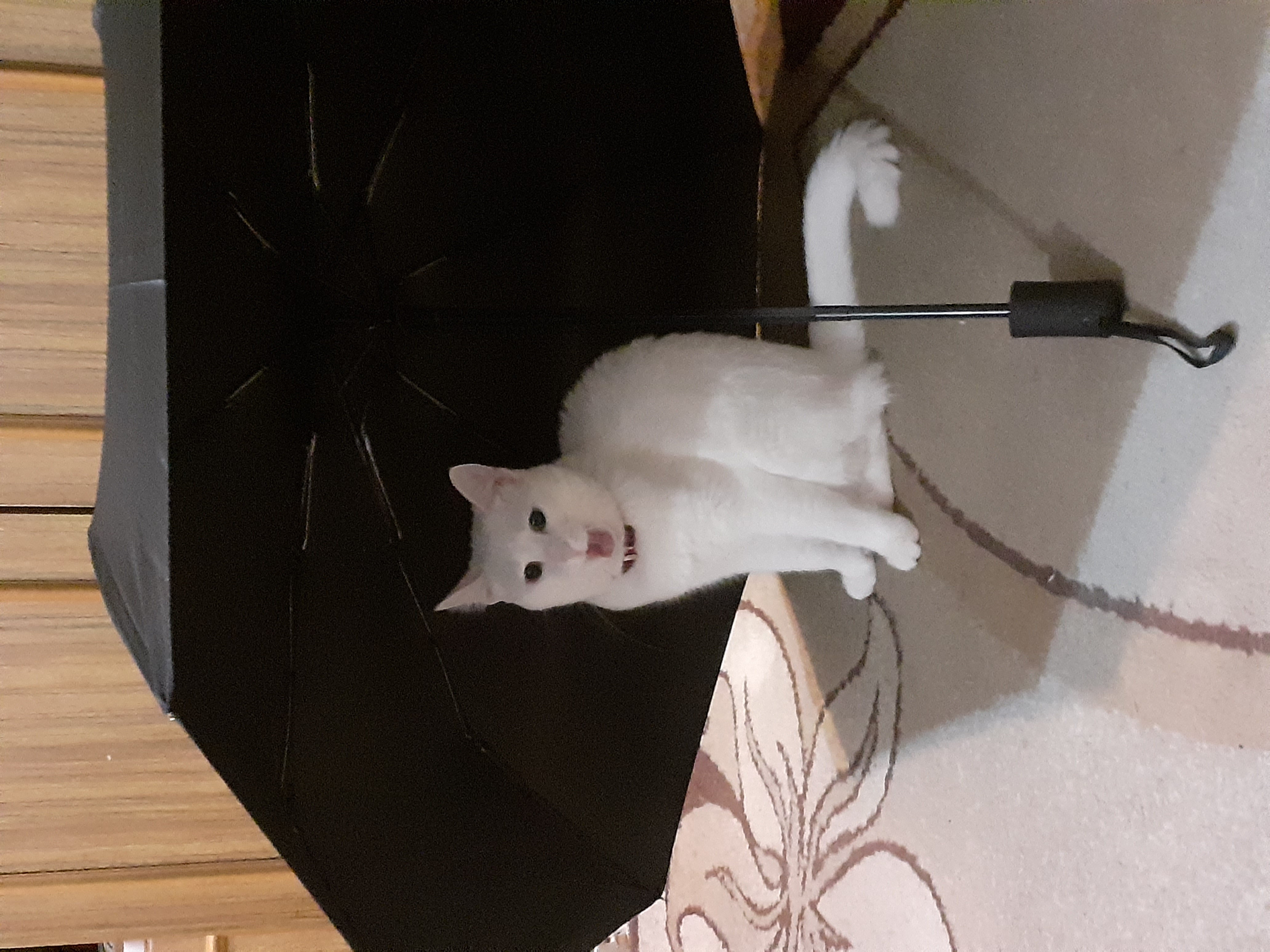 Маленькая кошечка, белоснежная, 1,5 месяца, это она уже большая (соло под зонтом), нашла рано утром в подъезде.