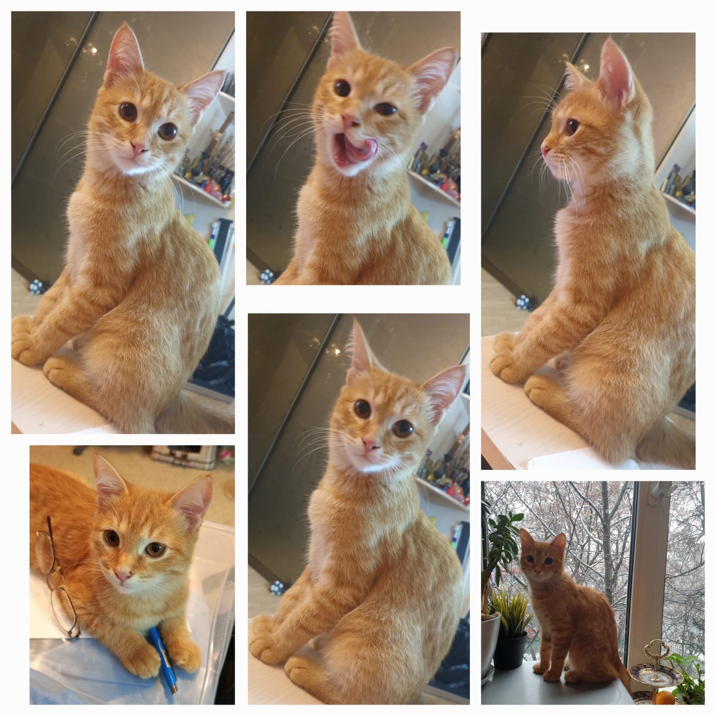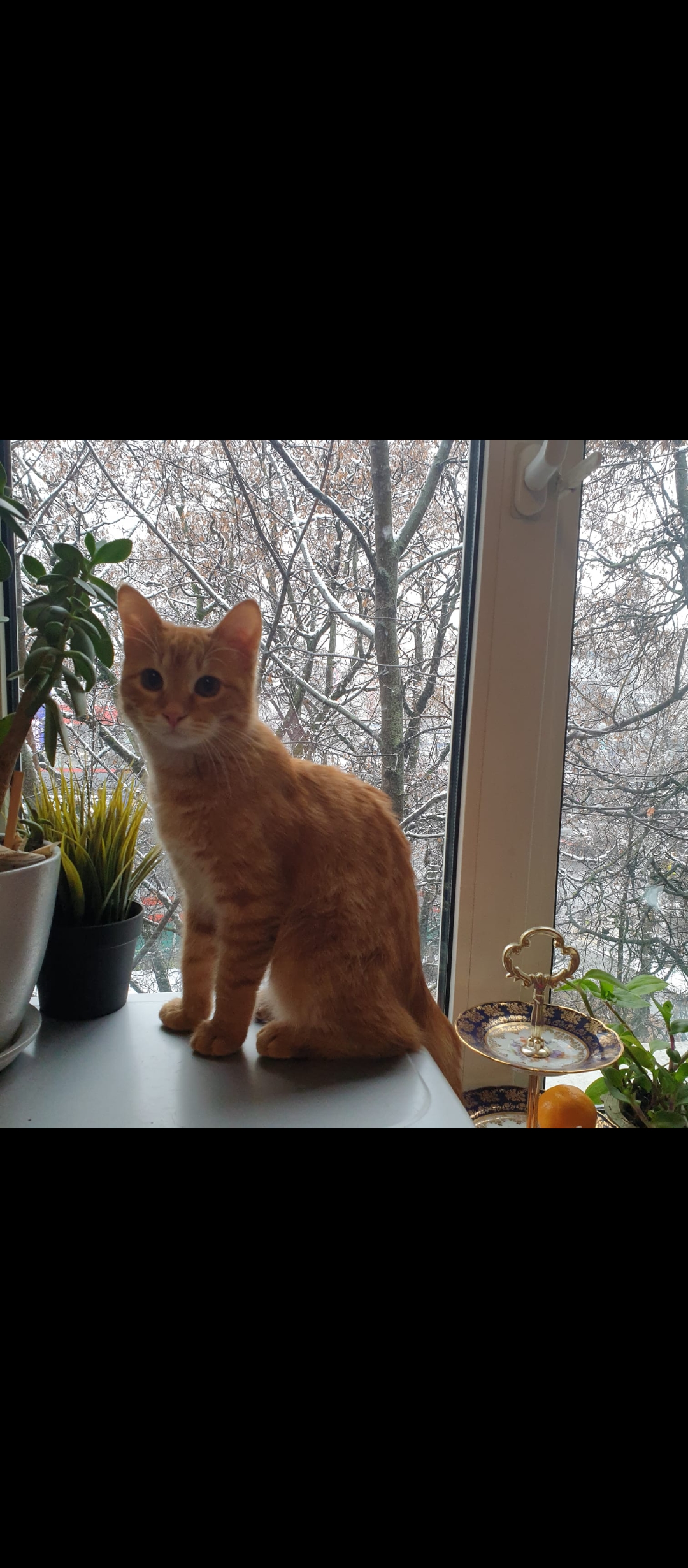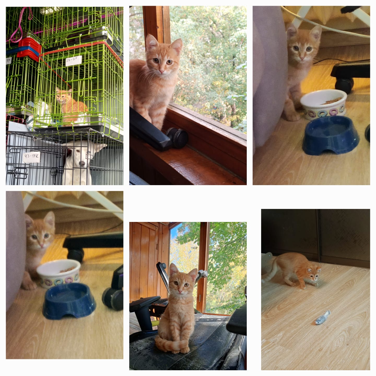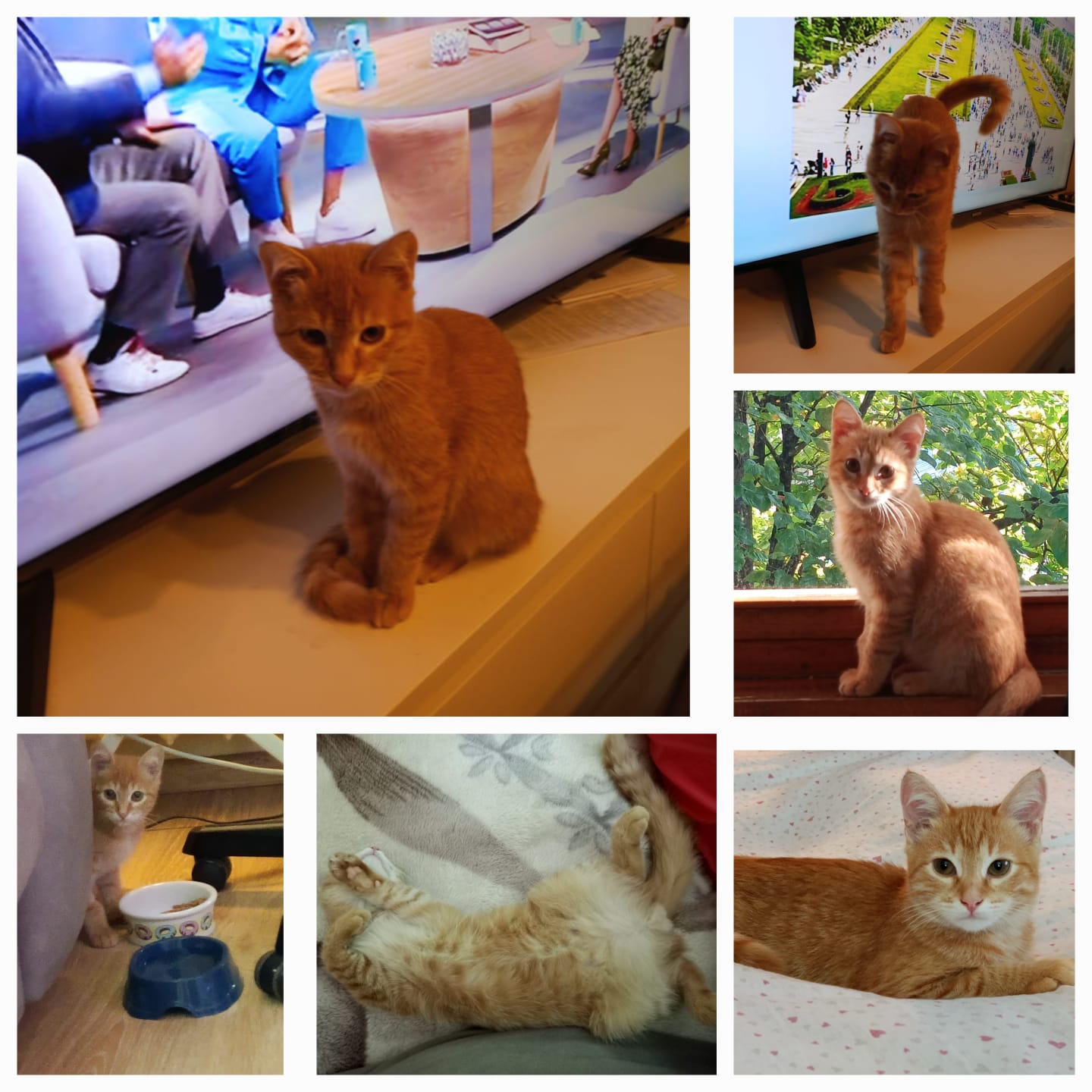 Котенок стал ярко-рыжего, с белым, цвета в полосочку, а сначала цвет был бледным. Тигруля освоился, везде в квартире теперь у него все знакомое, особенно ему нравится наблюдать за водной черепахой в аквариуме. И один раз он туда свалился! Выпрыгнул, вопил, весь мокрый, трясся, как осиновый лист, был такой смешной. И сразу понял, что был неправ. Терпеливо сидел в полотенце и в одеяле))