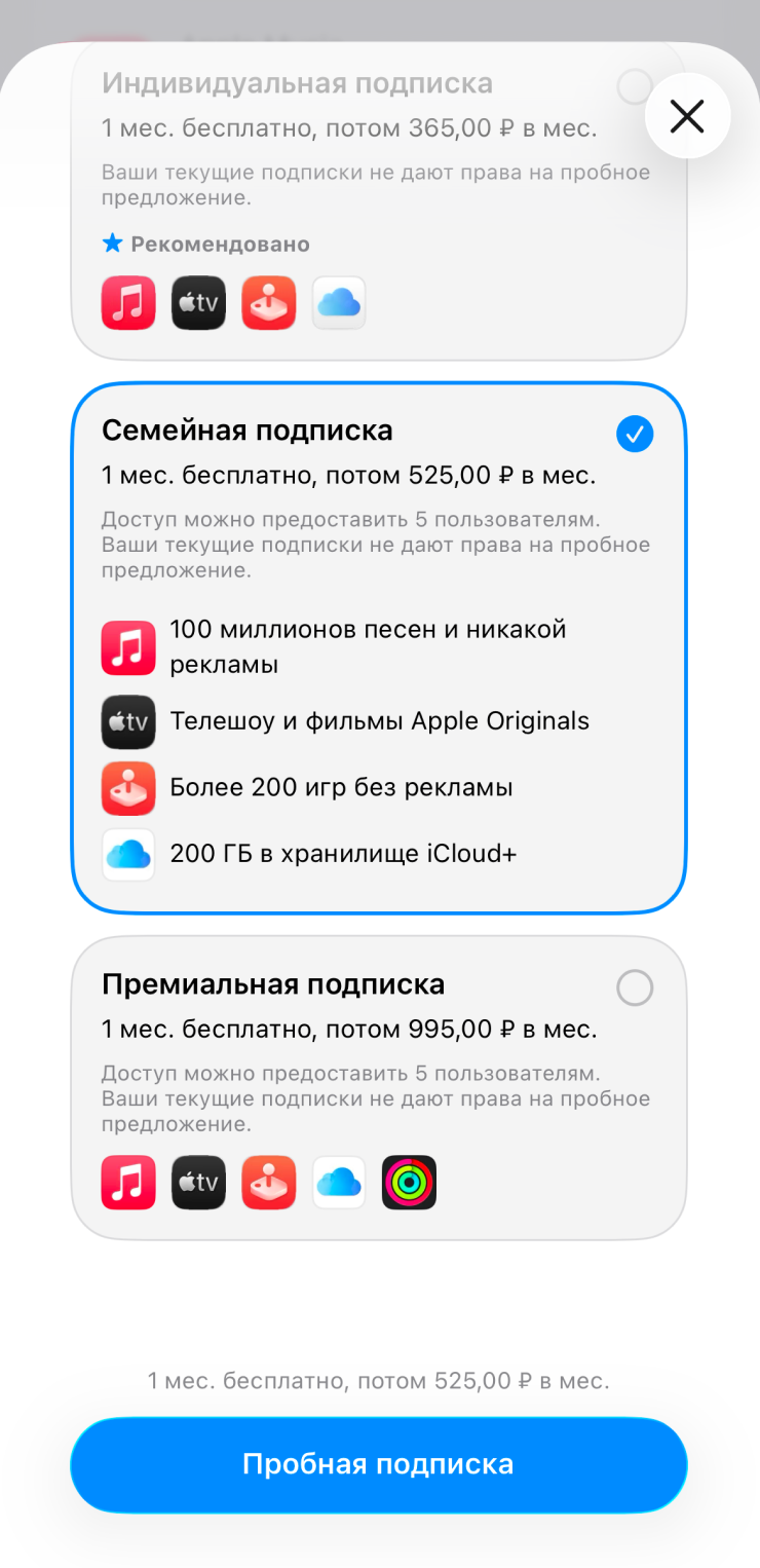Индивидуальный тариф действует на одну учетную запись Apple, а к семейному можно подключить до пяти участников, если настроен семейный доступ. Премиальная подписка тоже действует на всю семью и дополнительно включает сервис онлайн-тренировок Fitness+.