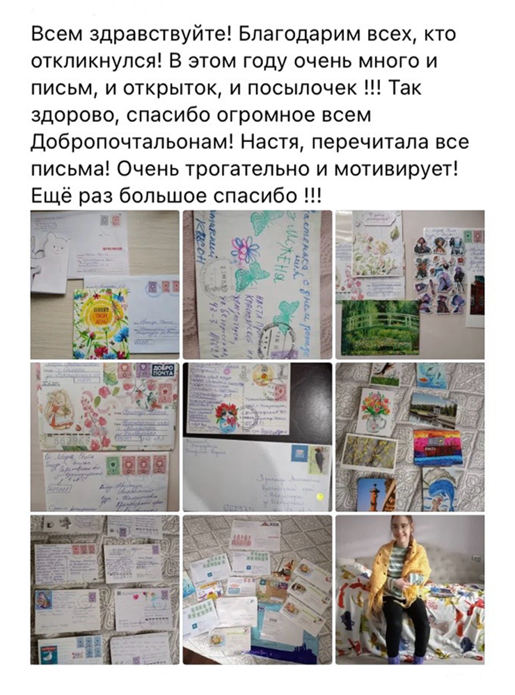 «Добропочта» живет и развивается. Я вижу это по публикациям участников с хештегом #добропочта во «Вконтакте» и благодарственным отзывам — их уже более 4 000. Родители ребят с инвалидностью рассказывают, как те ждут писем, просят перечитать их по многу раз и разглядывают открытки, а потом бережно хранят послания в шкатулке или ящике стола.