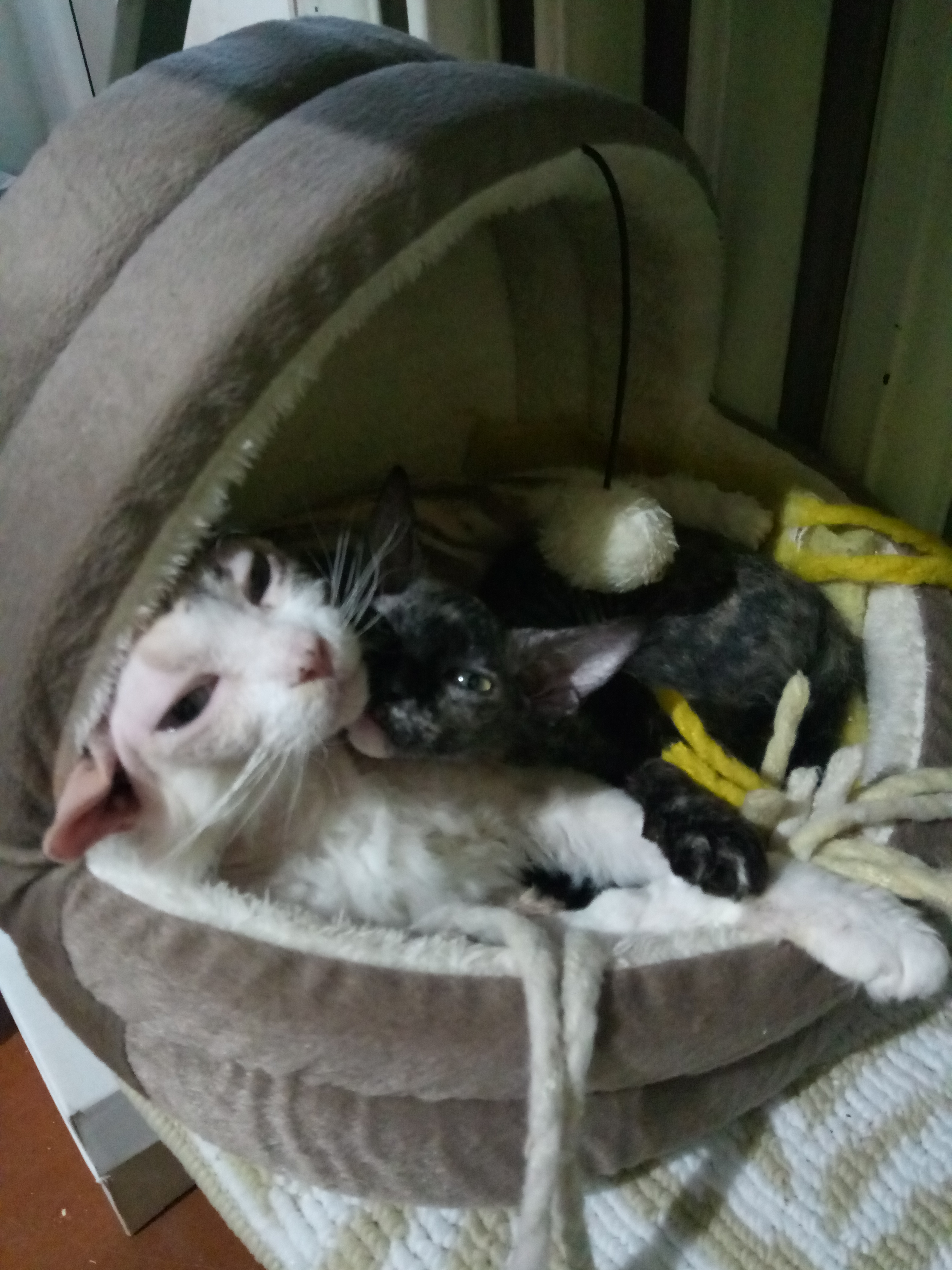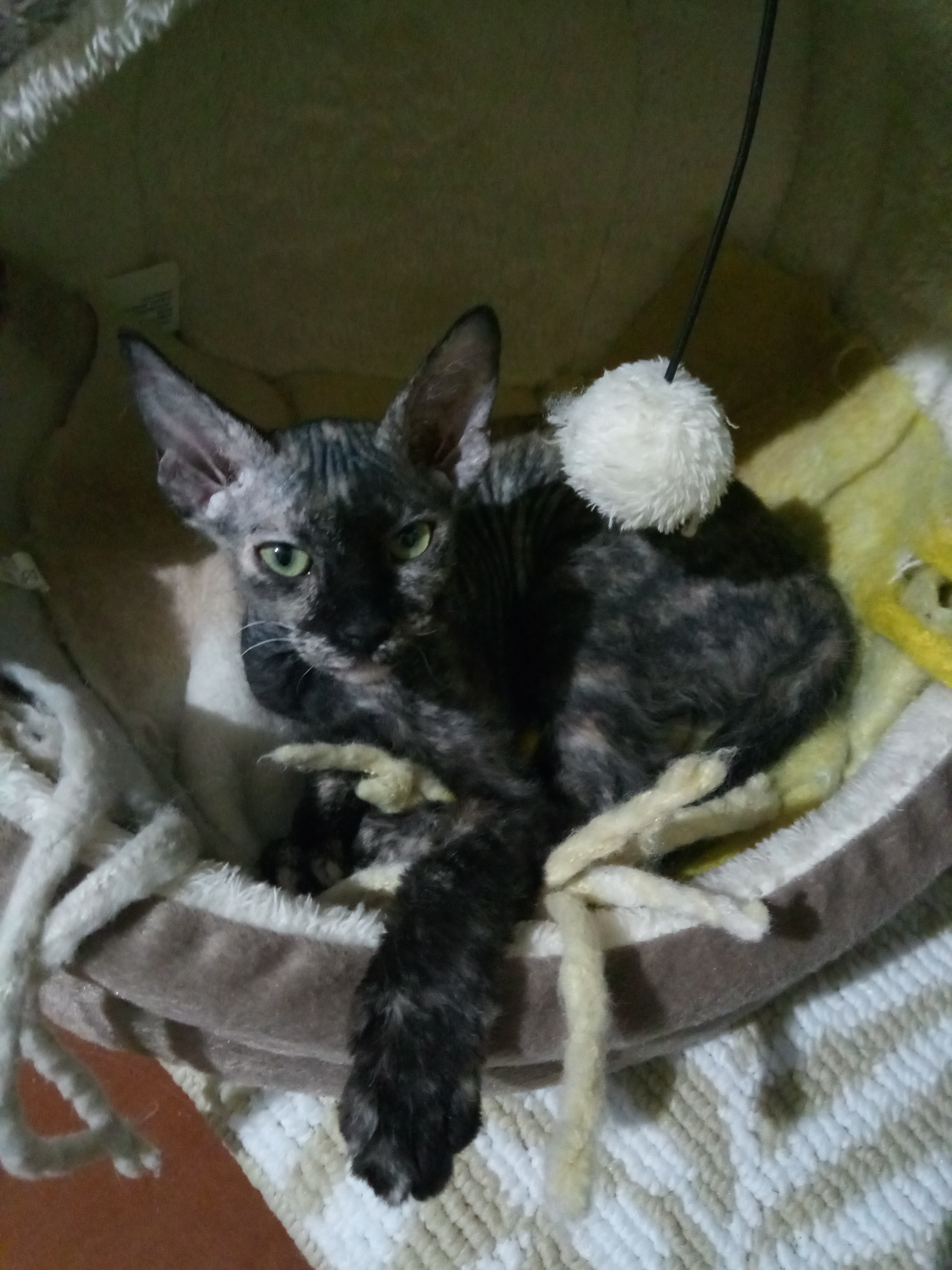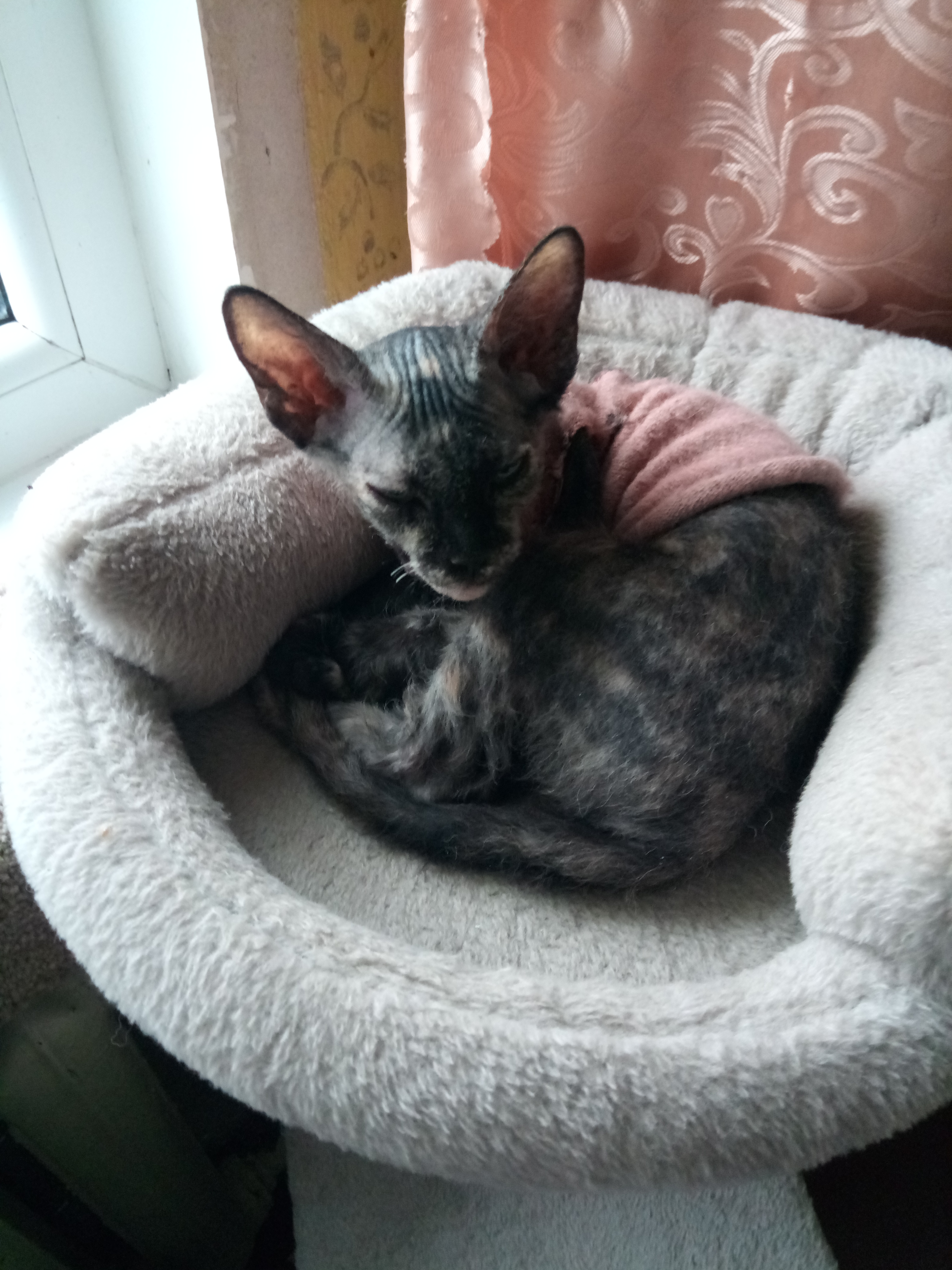 Лисита донской сфинкс браш. У меня уже есть взрослая Лакуся. И я захотела взять вторую кошечку именно такой породы в качестве компаньона. Думала очень долго над этим вопросом. Год думала. А тут в самый Новый Год 31 декабря 2025 года увидела фото и все, поплыла, решение пришло сразу — это моя, моя лисичка, и имя тут же возникло Лисита. Потому что она трехцветная, есть очень короткие шерстинки. Окрас, как у чернобурой лисички. Так и родилось имя.