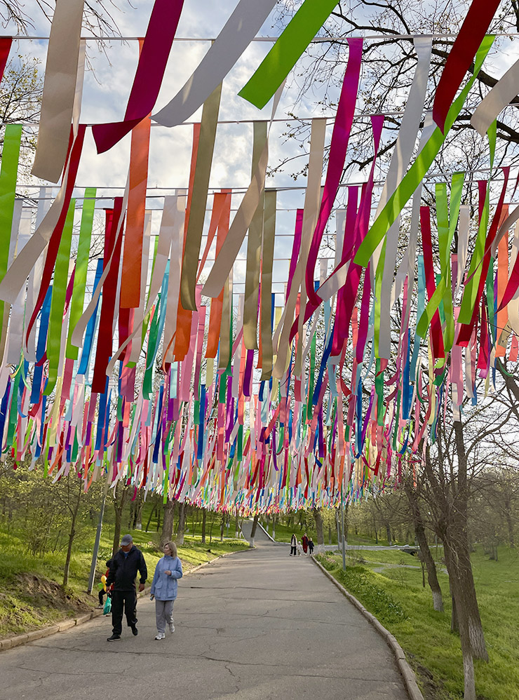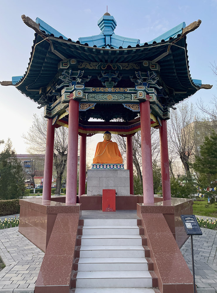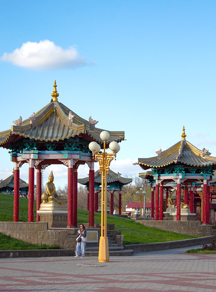 Парк «Дружба» — самое зеленое и тенистое место в Элисте. На первый взгляд он кажется обычным парком советской эпохи со скульптурами, аллеями и лавочками. Но от зеленых зон в других городах России его отличают колоритные детали: ротонда со статуей Будды Шакьямуни, беседка для игры в шахматы, разноцветные ленты, звон колокольчиков, качающихся на ветру.
