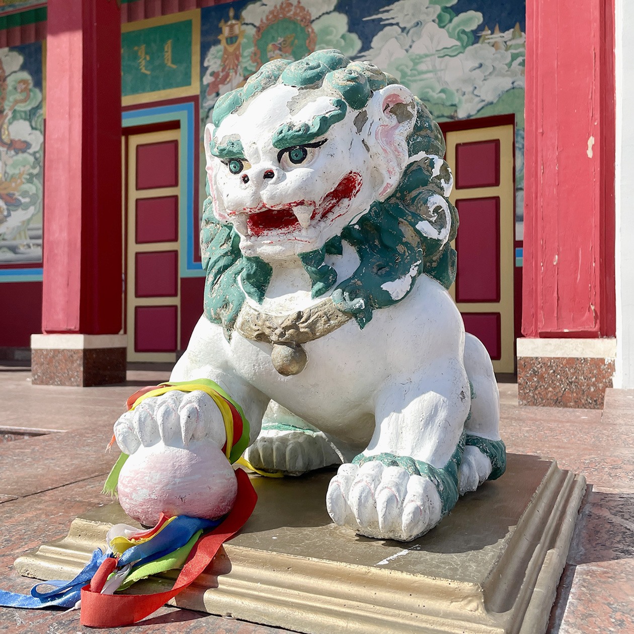 Снаружи хурул белый, с золотой изогнутой крышей и красными колоннами на входе. К нему ведет большая лестница с фонтаном по центру.