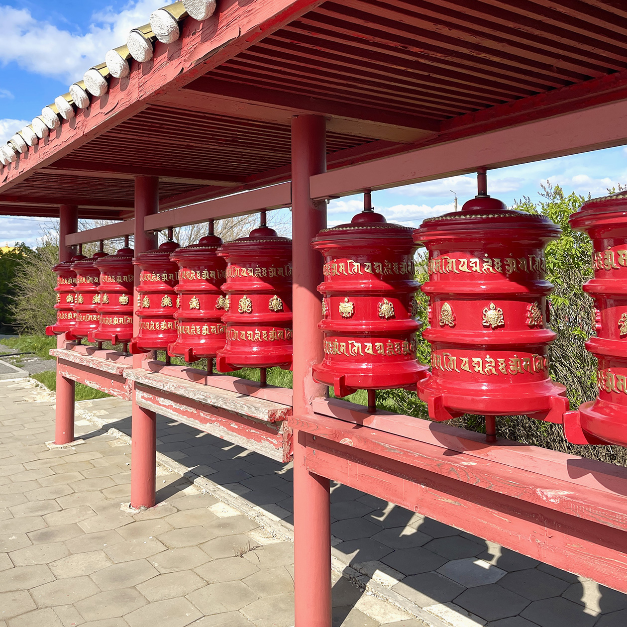 В центре пагоды установили металлический молитвенный барабан кюрде, украшенный сусальным золотом. Высота барабана составляет 1,8 м, диаметр — 1,2 м, внутри него — свитки с мантрами . Барабан вращают по часовой стрелке, одновременно начитывая мантру.