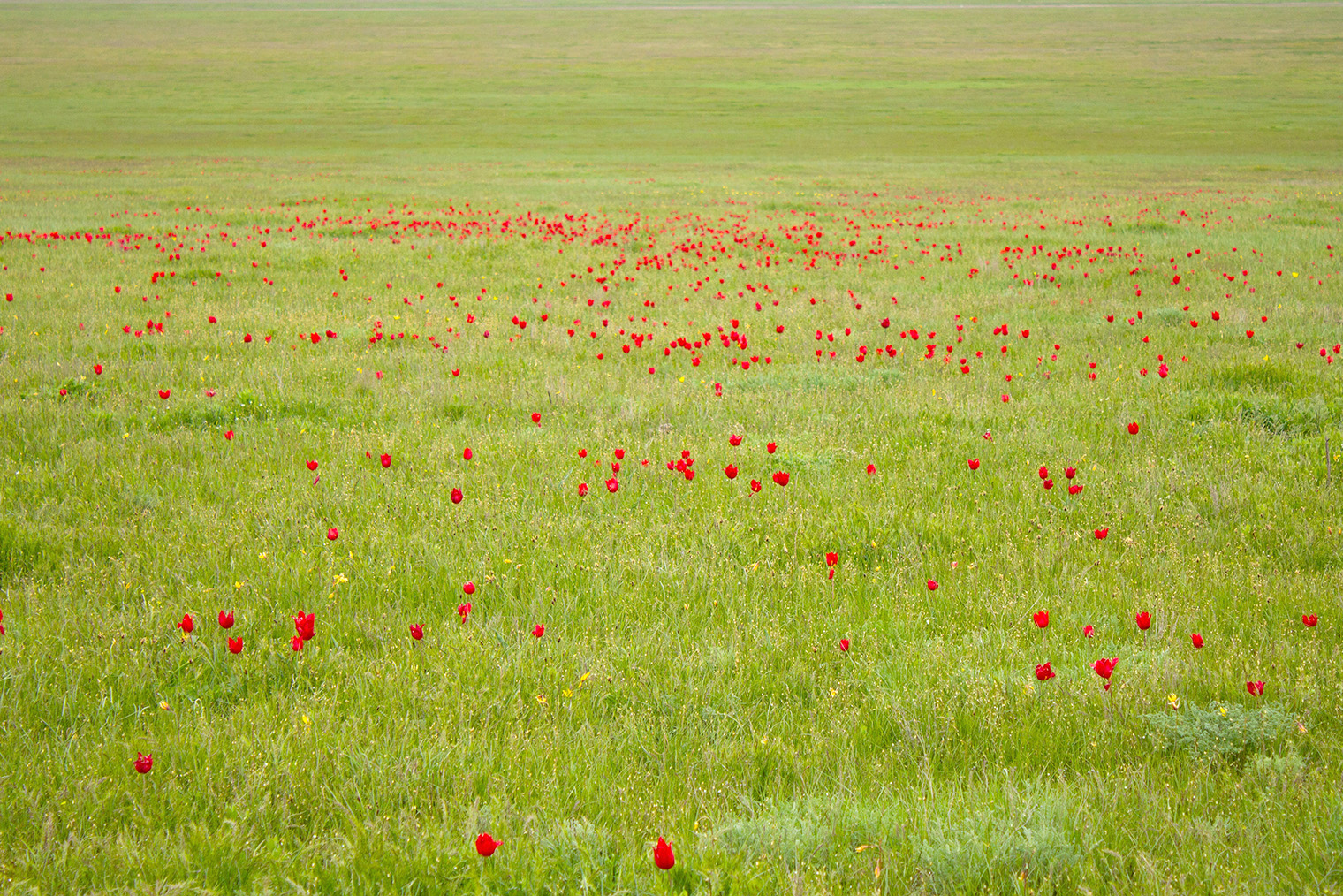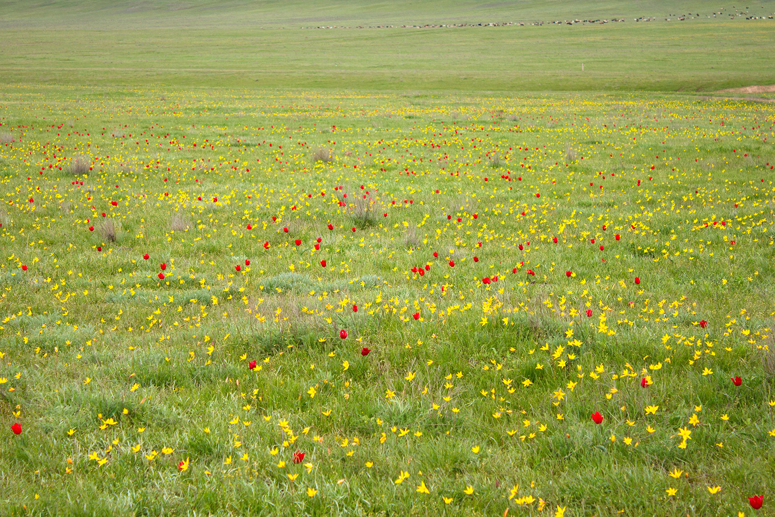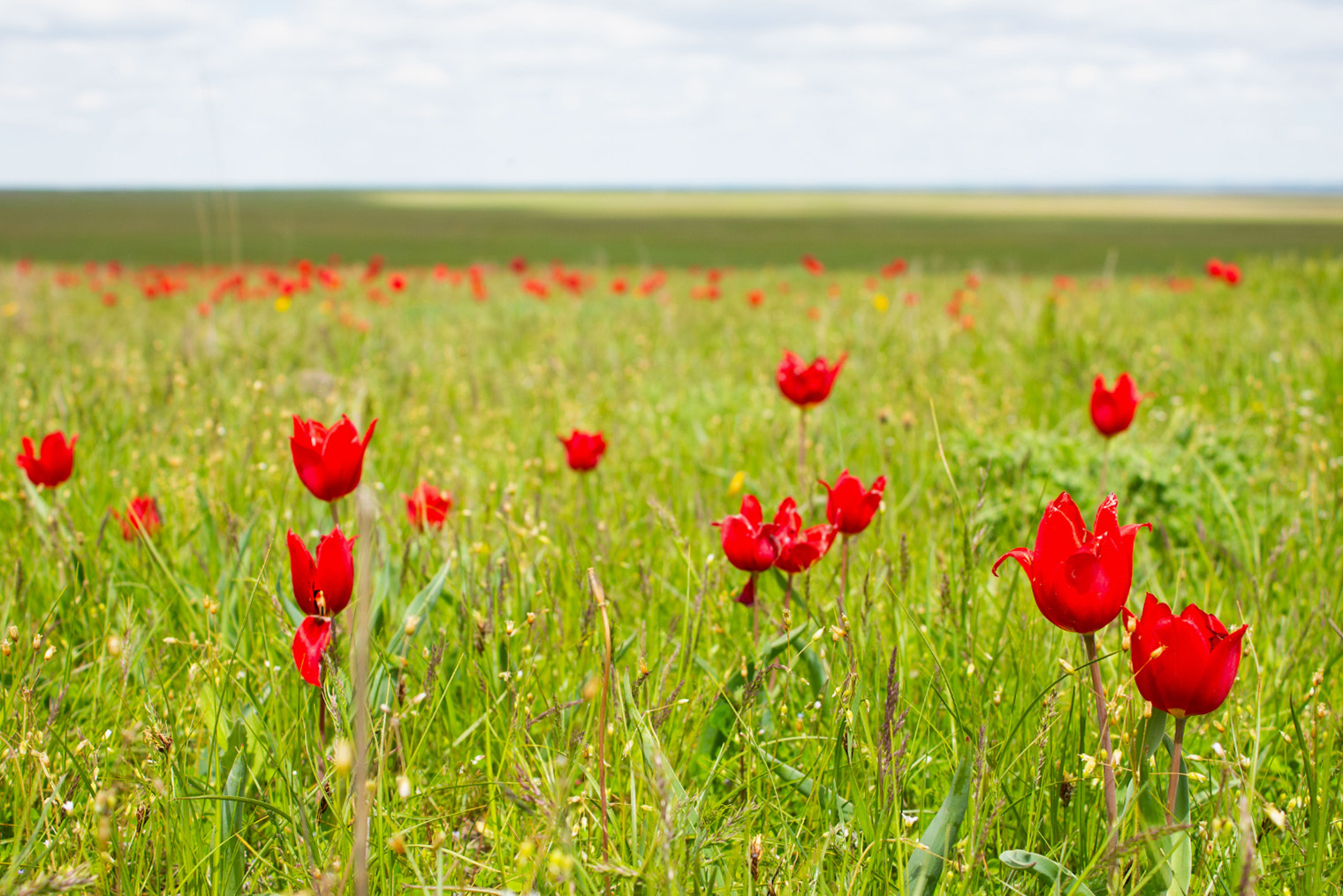 Дикорастущие тюльпаны намного меньше привычных цветов из магазина и в целом на них не похожи. Но зрелище все равно завораживает. Скопления тюльпанов заметны издалека. Вблизи это множество маленьких отдельно стоящих цветков — красных, желтых, белых. Правда, советую заранее утихомирить воображение и не представлять себе, что вся степь усыпана ими: тюльпаны кучно цветут только на некоторых участках.