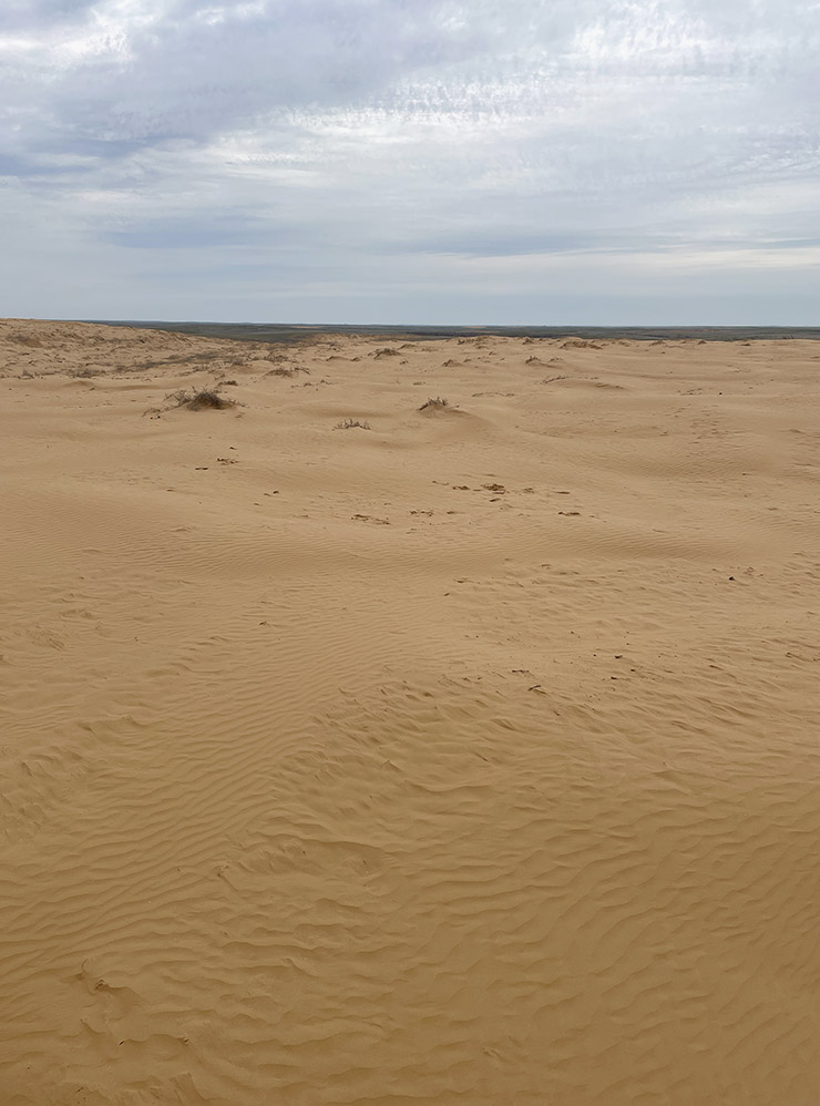 Поющие барханы — это участок песчаных дюн посреди степи. «Поющими» их называют, потому что песчинки на ветру иногда издают характерный рокот. Я ничего необычного не услышала, но было интересно погулять по бархану, который резко выделяется на фоне степей с низкими кустарниками и редкой травой. Дюны окружены легендами: по одной из них, здесь похоронен сам Чингисхан.