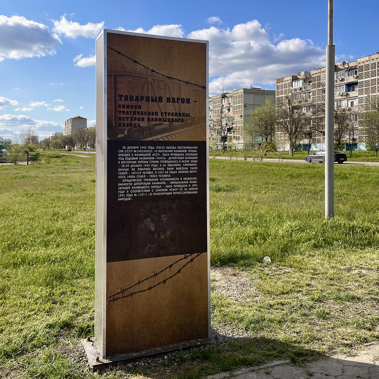 Бронзовый памятник стоит на вершине искусственного холма, туда поднимаются по спирали. В скульптуре сочетается множество изображений-символов: например, лица, лотосы, голова лошади. Рядом с памятником есть небольшой сквер с лавочками. Там на рельсах стоит товарный вагон — именно в таких калмыки покидали свою родину.