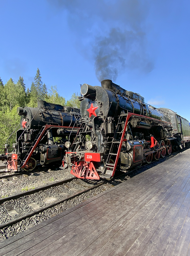 Еще один любимый туристами аттракцион — ретропоезд «Рускеальский экспресс». Состав на паровозной тяге с вагонами в стиле царской России ходит сюда из Сортавалы.