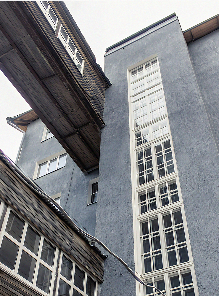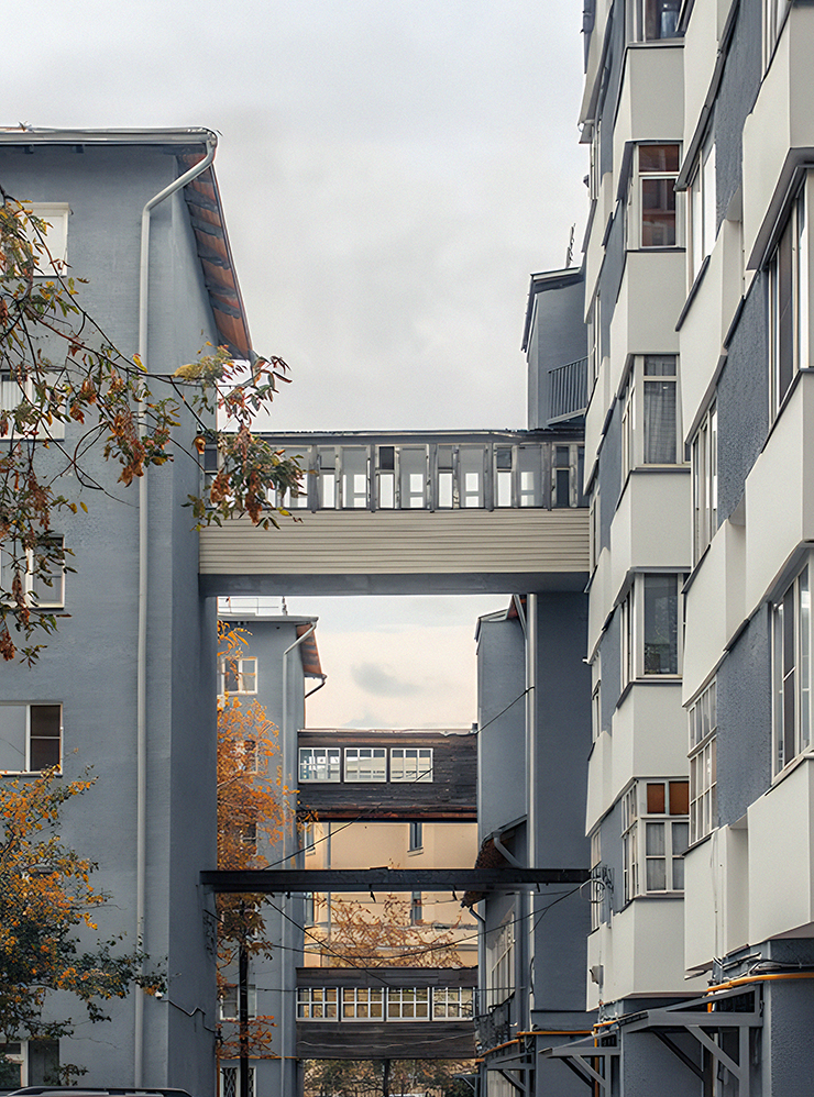 Шестиэтажное здание из пяти корпусов, соединенных воздушными переходами, — попытка воплотить в жизнь популярную в 1920-е годы идею создания нового, частично обобществленного быта. Здание в стиле конструктивизма спроектировал архитектор Владимир Медведев, а в стройке участвовали обычные горожане. За общественный быт отвечали столовая, душевые, библиотека, медпункт, зал для собраний. В любое помещение можно было попасть не выходя на улицу — через специальные межкорпусные переходы.