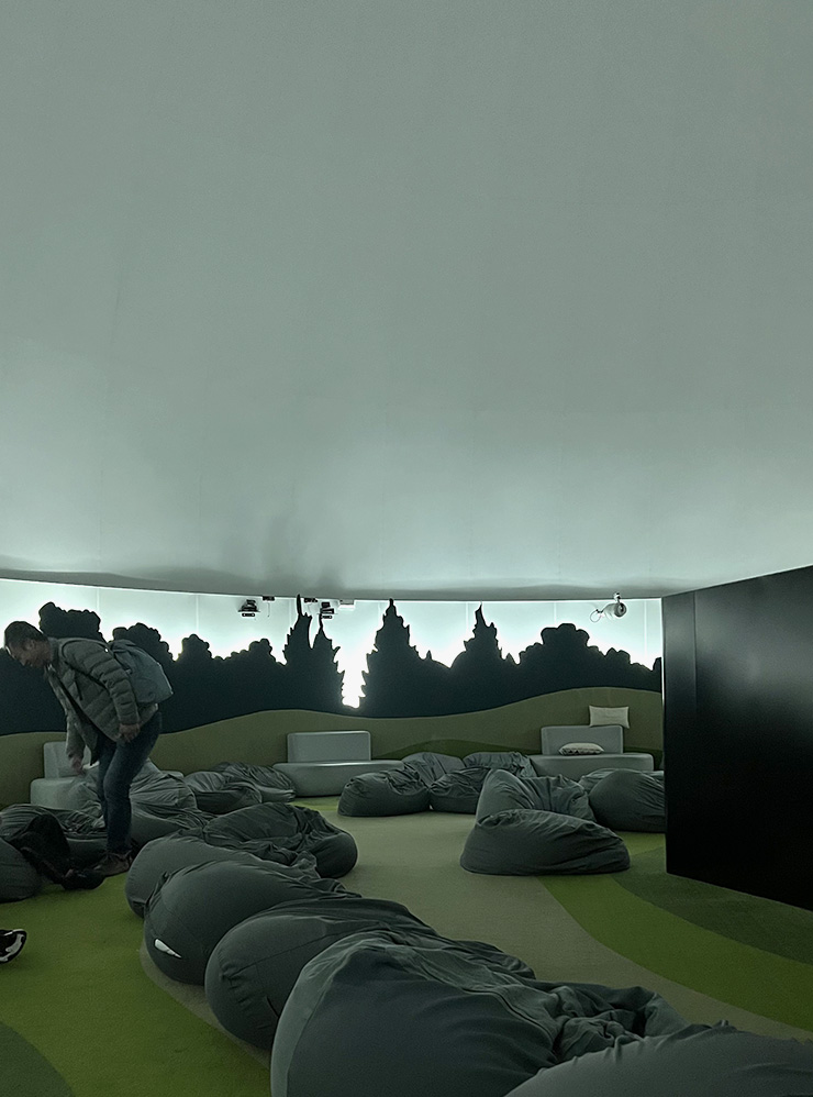 В круглой сфере находится основной зал-планетарий, где смотрят фильмы о космосе: изображение проецируют на купол. Зал похож на те, что есть в планетариях Москвы и Санкт-Петербурга, но качество картинки лучше. Озвучка на китайском языке, но я все равно сходил на один сеанс.