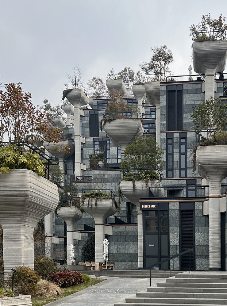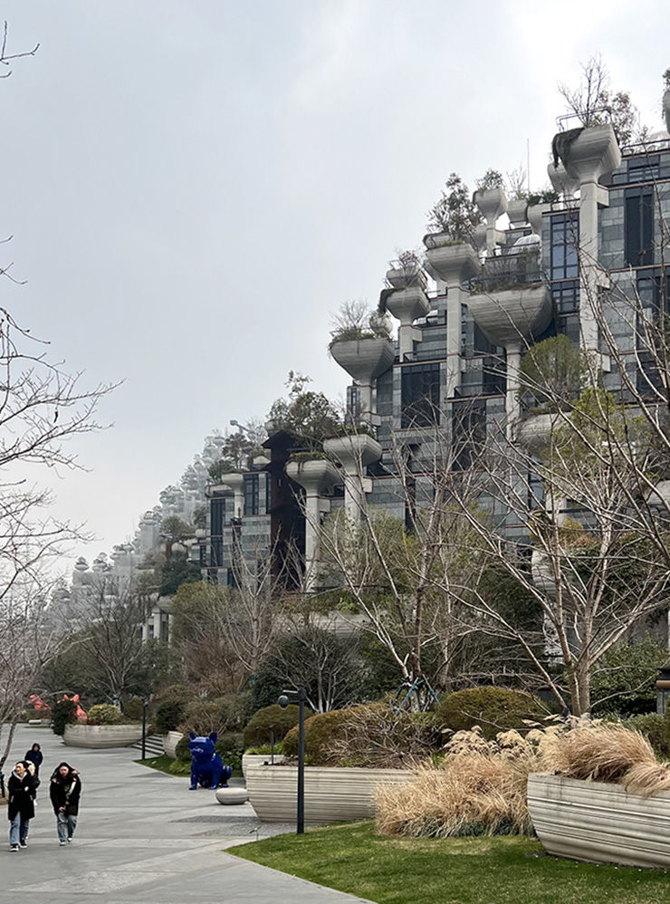 Здесь авторы вдохновлялись легендой об одном из чудес света — висячих садах Семирамиды — и горами национального парка «Хуаншань». Так появилась идея ступенчатого каскада с бетонными колоннами, на чьих вершинах посадят более 1 000 деревьев и 250 000 растений. Внутри колонн — система орошения.