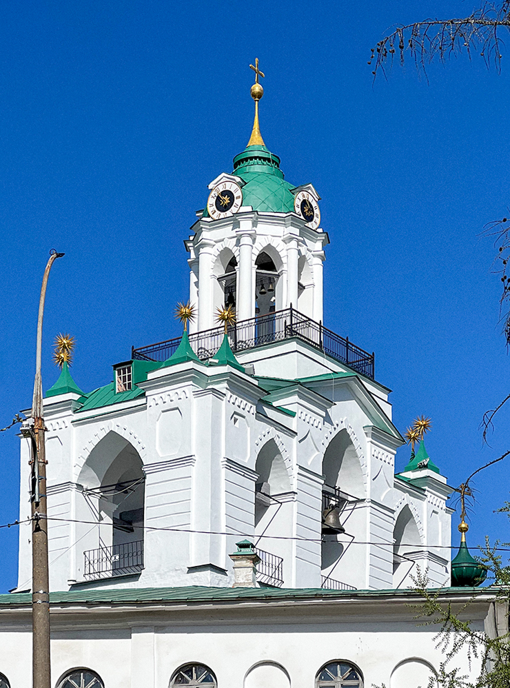 Кроме Спасо-Преображенского собора 16 века и других старинных построек на территории есть 32-метровая звонница со смотровой площадкой. С мая по октябрь туристы поднимаются на верхний ярус, откуда прекрасно видно исторический центр города, реку Которосль, парки и мосты. Правда, подниматься нужно по узкой лестнице. При мне несколько туристов развернулись, так и не дойдя до смотровой площадки: подъем тяжелый, а высота пугает.