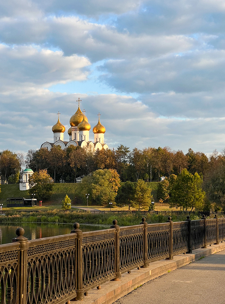 Если от Стрелки подняться по лестнице вверх, попадете на смотровую площадку с красивым видом на парк. За ней возвышается Успенский кафедральный собор с золотыми куполами — самый большой храм в Ярославле. В отличие от большинства известных церквей города, это современная постройка: ее возвели в 2000-х на месте древнего собора, уничтоженного в советское время.