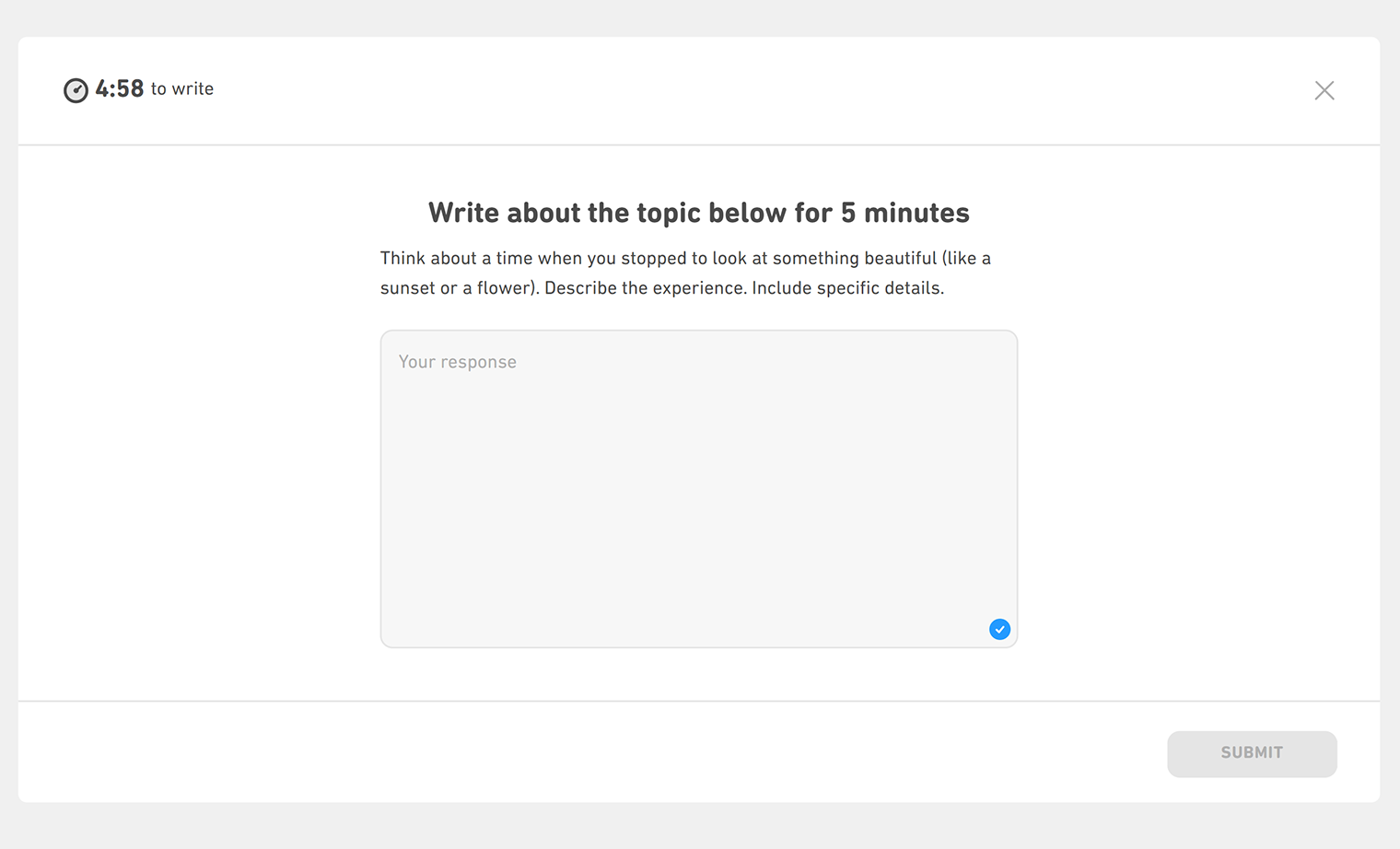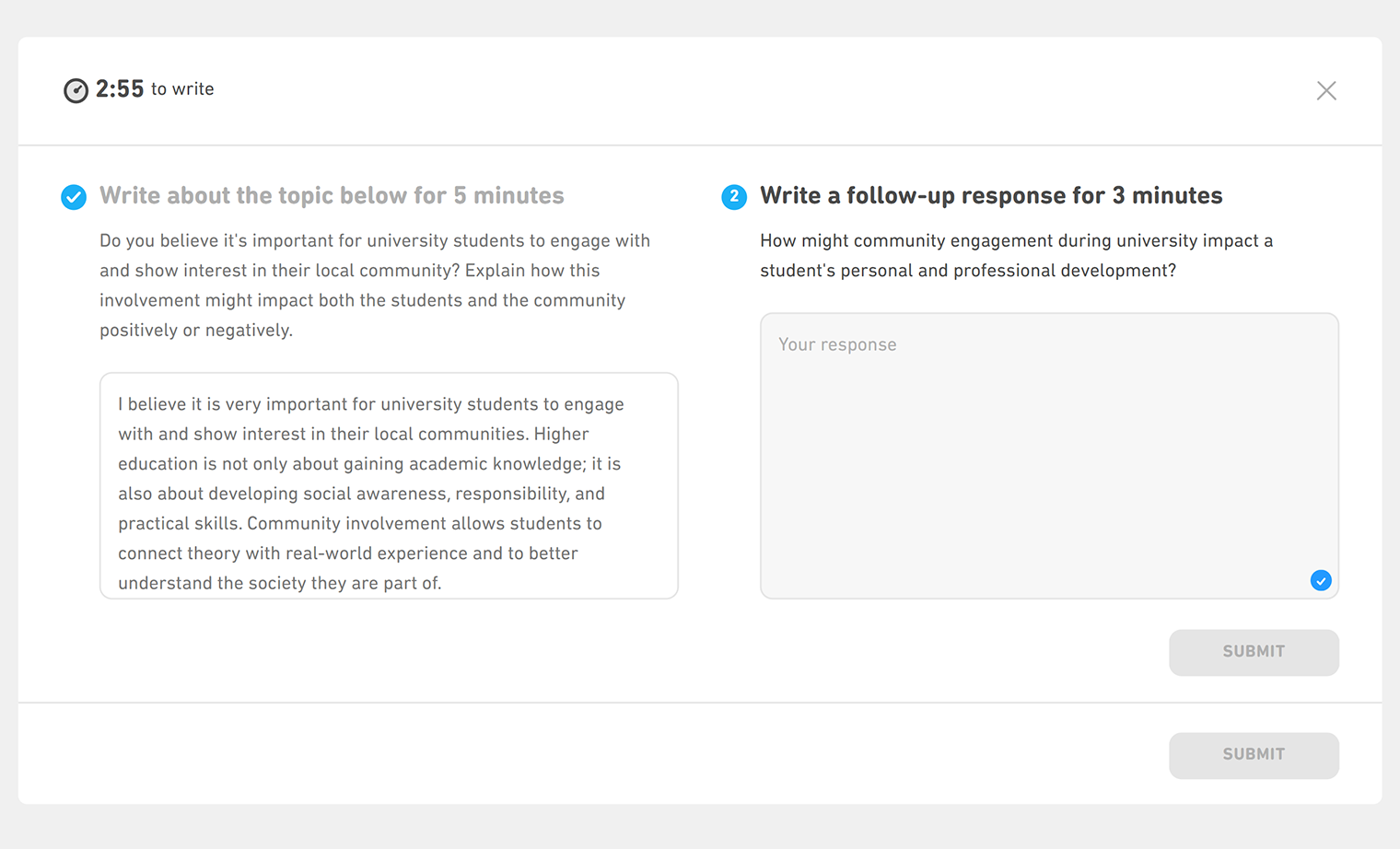 Interactive Writing. Сначала нужно письменно ответить на вопрос, на это дают 5 минут. Затем система задаст уточняющий вопрос по той же теме.