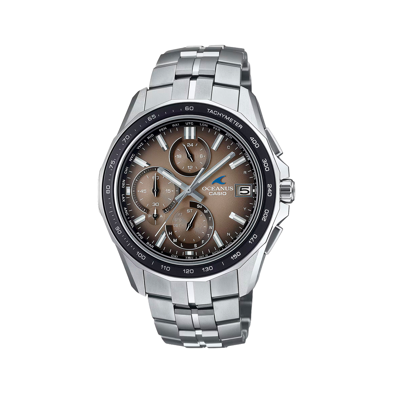 В новых моделях премиум-линейки Casio Oceanus корпус и браслет сделаны из титана, а безель — из сапфирового стекла: это прочные, но не тяжелые материалы. Часы можно зарядить от любого источника света (хоть от светодиодной лампы) и синхронизировать со смартфоном через Bluetooth, чтобы время настраивалось автоматически. В модели есть много дополнительных функций, например хронограф , календарь до 2099 года, учет 38 часовых зон и радиосинхронизация с мировыми часами.