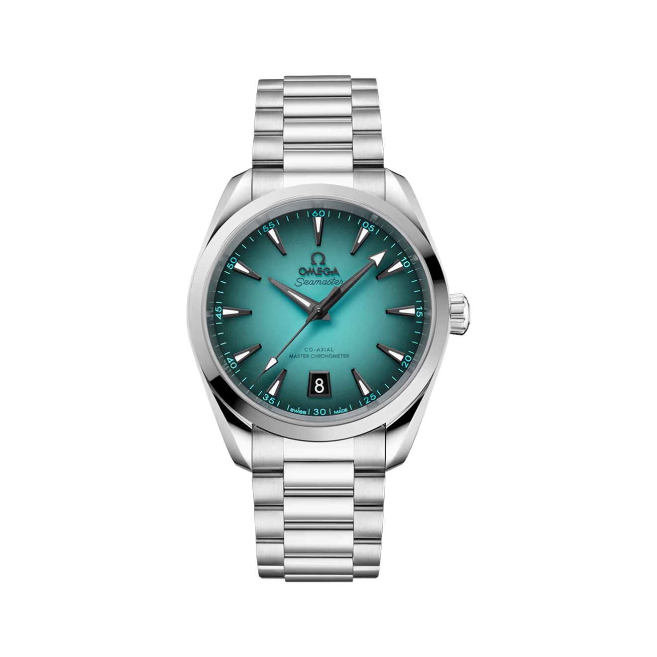 Линейка Aqua Terra — спортивная модель в дайверском стиле. Лакированный бирюзовый циферблат с градиентным эффектом вдохновлен цветом океана. У модели хронометрическая точность: допустимая средняя суточная погрешность хода — от 0 до +5 секунд, это очень высокий показатель для механических часов.