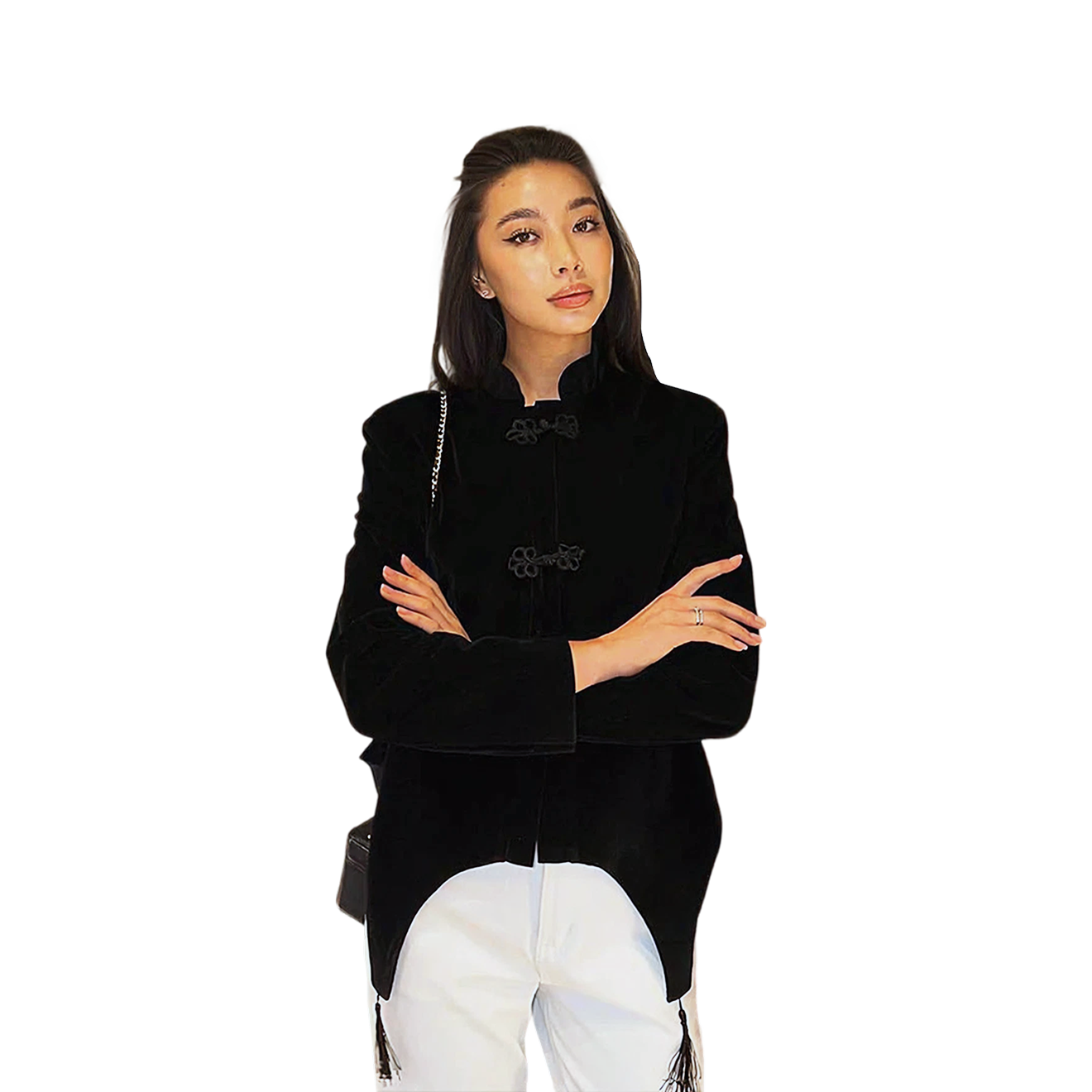 В таком жакете легко представить как дрессировщицу львов на арене, так и фешен-диву на весенней веранде. Кроме азиатских застежек-клевантов из интересных деталей выделяются баска с имитацией пояса для чулок, словно из середины прошлого века, кисточки и воротник-стойка