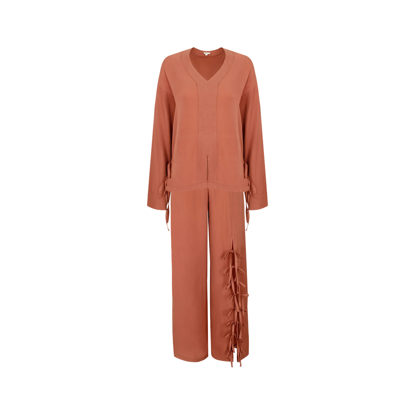 Хоть этот комплект российского бренда Bunny Poem и относится к домашней одежде, назвать его пижамой сложно. Все из-за нарядного внешнего вида: насыщенный сливовый оттенок, акцентные рукава-буфы, блестящие пуговицы и вышитые аппликации в виды цветков сакуры на карманах брюк. Состав тоже порадовал: микс из двух натуральных материалов — хлопка и льна