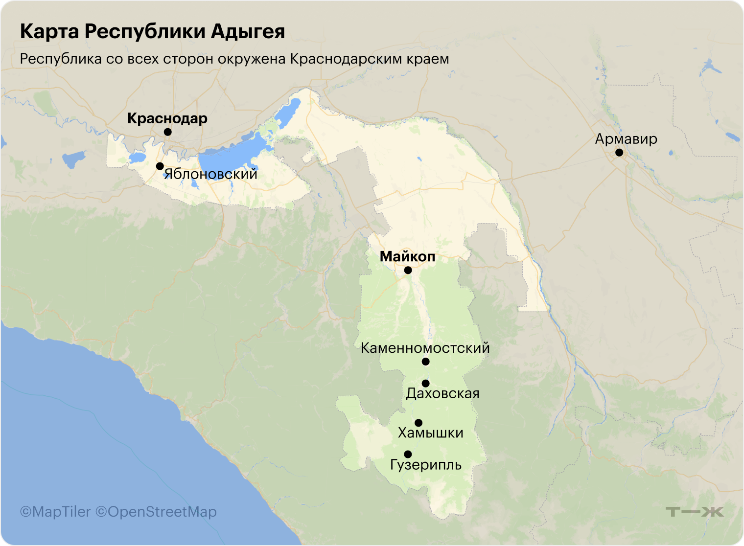 Адыгея — небольшой регион , который со всех сторон окружен Краснодарским краем. Там всего два города: Майкоп — столица республики — и Адыгейск. Все остальное — села, поселки, станицы, хутора и аулы.