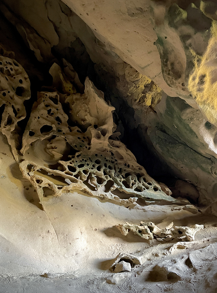 Грот Крыло Ангела получил свое название благодаря ажурным узорам на стенах. Углубления образовались в результате выветривания песчаника.