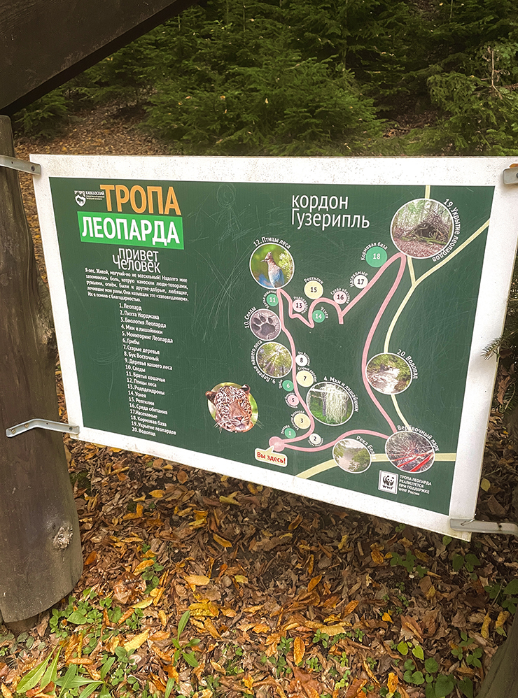 Гузерипль. В заповедник попадают через КПП, или кордоны. Один из КПП находится в поселке Гузерипль. Сразу за этим пунктом пропуска начинается «Тропа леопарда» — кольцевой экомаршрут длиной 1,7 км через пихтовый лес. Если идти не спеша, можно провести на тропе два-три часа, разглядывая деревья и стенды с информацией о леопардах. Еще там есть логово этого хищника, построенное сотрудниками заповедника. Но сами леопарды на этой тропе никогда не появлялись. Вход платный.
